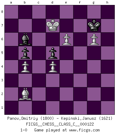 Last move : 1-0 2010 February 13 19:26:26 [Event "FICGS__CHESS__CLASS_C__000122"] [Site "FICGS"] [Date "2009.08.21"] [Round "1"] [White "Panov,Dmitriy"] [Black "Kepinski,Janusz"] [Result "1-0"] [WhiteElo "1800"] [BlackElo "1621"] 1.e4 e6 2.d4 d5 3.e5 b6 4.f4 c5 5.c3 cxd4 6.cxd4 Be7 7.Nf3 Nh6 8.Bd3 f5 9.exf6 Bxf6 10.O-O O-O 11.h3 Ba6 12.g4 Nf7 13.Nc3 h6 14.Be3 Bxd3 15.Qxd3 Nc6 16.a3 Qd7 17.Ne5 Nfxe5 18.fxe5 Be7 19.Qg6 Rxf1+ 20.Rxf1 Rf8 21.Bxh6 Rxf1+ 22.Kxf1 Bd8 23.Be3 Qf7+ 24.Qxf7+ Kxf7 25.Kg2 a6 26.Kg3 Na5 27.h4 Nc4 28.Bc1 b5 29.g5 g6 30.Kg4 Bb6 31.Ne2 Na5 32.b4 Nc6 33.Bb2 a5 34.h5 gxh5+ 35.Kxh5 Kg7 36.Nf4 Nd8 37.g6 Kf8 38.Kg5 axb4 39.axb4 Kg8 40.Kf6 Bc7 41.Nxe6 Nxe6 42.Kxe6 Kg7 43.Kd7 Bb6 44.e6 1-0 French : Advance variation Kingside Castling by player White (move 10) Kingside Castling by player Black (move 10) 10 pieces endgame at move 42 : White KBPPPP , Black KBPP WHITE : King + 1 Bishop 4 Pawns BLACK : King + 1 Bishop 2 Pawns Player White won this chess game. Follow this game move after move (download)Bobby is the most misunderstood, misquoted celebrity walking the face of this earth. (Yasser Seirawan) Am wohlsten fühle ich mich, wenn ich sehe, wie sich mein Gegner im Todeskampf windet. (Robert James Fischer) Jugadores de primera clase pierden en contra de jugadores de segunda clase porque los jugadores de segunda clase a veces juegan una partida de primer clase. (Siegbert Tarrasch) Avant la finale, les dieux ont créé le milieu de partie. (Tarrasch) Real knowledge is to know the extent of one's ignorance. (Confucius)