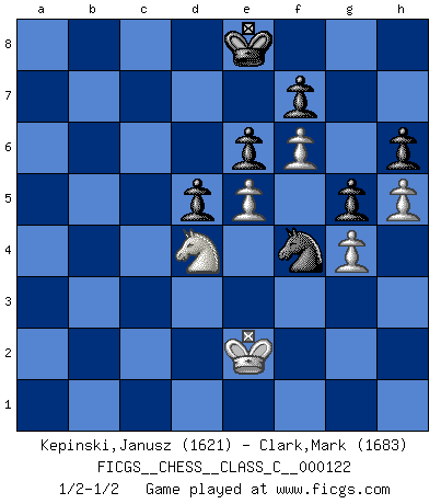 Last move : 1/2-1/2 2010 February 2 14:48:36 [Event "FICGS__CHESS__CLASS_C__000122"] [Site "FICGS"] [Date "2009.08.21"] [Round "1"] [White "Kepinski,Janusz"] [Black "Clark,Mark"] [Result "1/2-1/2"] [WhiteElo "1621"] [BlackElo "1683"] 1.d4 e6 2.e4 d5 3.e5 c5 4.c3 Nc6 5.Nf3 Nge7 6.dxc5 Ng6 7.Bb5 Bxc5 8.Bxc6+ bxc6 9.O-O Qb6 10.b4 Be7 11.Be3 Qc7 12.Bd4 a5 13.a3 axb4 14.cxb4 O-O 15.Nc3 Ba6 16.Re1 c5 17.bxc5 Bxc5 18.Bxc5 Qxc5 19.Na4 Qa5 20.Nb2 Rab8 21.Nd3 Bxd3 22.Qxd3 Rfc8 23.Rec1 h6 24.h3 Nf4 25.Rxc8+ Rxc8 26.Qd2 Qxd2 27.Nxd2 Nd3 28.Nf3 Ra8 29.a4 Ra5 30.Kf1 Nc5 31.Ke2 Nxa4 32.Ra3 Kf8 33.Nd4 Ra6 34.f3 Nc5 35.Rxa6 Nxa6 36.f4 Nc5 37.Ke3 Ke7 38.g4 Ne4 39.f5 Kd7 40.h4 g6 41.f6 Nc3 42.h5 g5 43.Nf3 Ne4 44.Ke2 Ke8 45.Ke3 Kf8 46.Kd4 Nf2 47.Nh2 Nh3 48.Ke3 Ke8 49.Nf3 Kd7 50.Nd4 Nf4 51.Kd2 Ng2 52.Kd3 Ke8 53.Ke2 Nf4+ 1/2-1/2 Queen's pawn Kingside Castling by player White (move 9) Kingside Castling by player Black (move 14) This chess game ended in a draw. Follow this game move after move (download)When I have White, I win because I am white; When I have Black, I win because I am Bogolyubov. (Bogolyubov) Die westlichen Werte sind eine Sprache, welche die Putin-Administration nicht versteht. (Garry Kasparov) El jugador táctico sabe que hacer cuando hay algo que hacer; mientras que el estratega sabe que hacer cuando no hay nada que hacer. (Gerald Abrahams) Les Echecs sont et restent toujours un combat, un combat intégral comme la boxe, la lutte ou un autre sport, et où il doit y avoir un vainqueur et un vaincu. (Joseph Emil Diemer) The obstacle is the path. (Zen proverb)