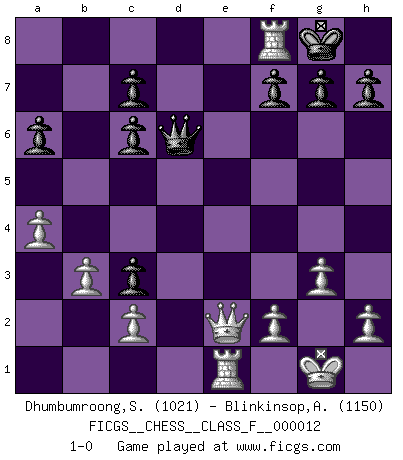 Last move : 1-0 2006 October 18 6:56:56 [Event "FICGS__CHESS__CLASS_F__000012"] [Site "FICGS"] [Date "2006.09.23"] [Round "1"] [White "Dhumbumroong,Smith"] [Black "Blinkinsop,Adam"] [Result "1-0"] [WhiteElo "1021"] [BlackElo "1150"] 1.d4 e6 2.e4 d5 3.exd5 exd5 4.Nf3 Nc6 5.Nc3 Nf6 6.Bb5 Bd7 7.O-O a6 8.Bxc6 bxc6 9.Re1+ Be7 10.Ne5 O-O 11.Bg5 Rb8 12.a4 Bb4 13.Nxd7 Qxd7 14.Re5 Ng4 15.Re2 Bd6 16.Qe1 Bb4 17.Be7 Bxe7 18.Rxe7 Qd6 19.g3 Qb4 20.Qe2 Qxd4 21.Re1 Qf6 22.Qxg4 d4 23.b3 Rbe8 24.Rxe8 dxc3 25.Qe2 Qd6 26.Rxf8+ 1-0 Queen's pawn Kingside Castling by player White (move 7) Kingside Castling by player Black (move 10) Player White won this chess game. Follow this game move after move (download)Bobby is the finest Chess player this country ever produced. His memory for the moves, his brilliance in dreaming up combinations, and his fierce determination to win are uncanny. (John Collins) Nur ein wirklich starker Spieler weiß wie schwach er spielt. (Savielly Grigorievitsch Tartakower) Es el objetivo de la escuela moderna no tratar cada posición de acuerdo a una regla general, sino de acuerdo al principio inherente en la posición. (Richard Reti) Soyez une menace à chaque fois que vous vous asseyez pour jouer. (Ken Smith) Life is like a play: it's not the length but the excellence of the acting that matters. (Seneca)
