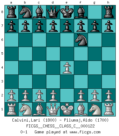 Last move : 0-1 2009 November 8 8:20:28 [Event "FICGS__CHESS__CLASS_C__000122"] [Site "FICGS"] [Date "2009.08.21"] [Round "1"] [White "Calvini,Lari"] [Black "Pllumaj,Aldo"] [Result "0-1"] [WhiteElo "1800"] [BlackElo "1700"] 1.e4 Nf6 0-1 This chess game has been lost on time (started : 2009.08.21 20:20:6) Alekhine's defense Player Black won this chess game. Follow this game move after move (download)The defensive power of a pinned piece is only imaginary. (Aaron Nimzovich) Der Schachmeister von Heute braucht Courage, einen Killerinstinkt, Ausdauer und Arroganz. (Larry Evans) Te sientas frente a un tablero y repentinamente tu corazón brinca. Tu mano tiembla al tomar una pieza y moverla. Pero lo que el Ajedrez te enseña es que tu debes permanecer ahí con calma y pensar de que si realmente es una buena idea o de que si hay otras ideas mejores. (Stanley Kubrick) Ce n'est pas pour s'amuser qu'il joue aux échecs : il célèbre un culte. (Vladimir Nabokov) Rules and bones are meant to be broken. (Anonymous)