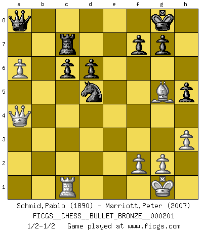 Last move : 1/2-1/2 2010 April 12 22:45:2 [Event "FICGS__CHESS__BULLET_BRONZE__000201"] [Site "FICGS"] [Date "2010.04.12"] [Round "1"] [White "Schmid,Pablo"] [Black "Marriott,Peter"] [Result "1/2-1/2"] [WhiteElo "1890"] [BlackElo "2007"] 1.e4 e5 2.Nf3 Nc6 3.Bc4 Bc5 4.c3 Nf6 5.d4 exd4 6.cxd4 Bb4+ 7.Nbd2 Bxd2+ 8.Bxd2 Nxe4 9.d5 Ne7 10.Bb4 d6 11.O-O O-O 12.Re1 a5 13.Ba3 Nf6 14.b3 Bg4 15.Bb2 Ng6 16.h3 Bxf3 17.Qxf3 a4 18.bxa4 Rxa4 19.Qb3 Ra7 20.a4 Re8 21.Bb5 Rxe1+ 22.Rxe1 Ra8 23.Bc3 Nf4 24.Bd2 N4xd5 25.Bc4 c6 26.Qxb7 Rb8 27.Qa6 Qc7 28.a5 h6 29.Bxd5 Nxd5 30.Qd3 Ra8 31.Ra1 Nf6 32.Bc3 Nd5 33.Bd2 h5 34.Rb1 Ra7 35.Qc4 Qc8 36.Rc1 Rc7 37.a6 Qa8 38.Bg5 Nb6 39.Qd4 Nd5 40.Qa4 Nb6 41.Qa5 Nd5 42.Qa4 Nb6 43.Qa5 Nd5 44.Qa4 1/2-1/2 Giuoco Piano Kingside Castling by player White (move 11) Kingside Castling by player Black (move 11) This chess game ended in a draw. Follow this game move after move (download)The mistakes are there, waiting to be made. (Savielly Tartakower) Wir irren allesamt, nur jeder irrt anders. (Georg Christoph Lichtenberg) Después de la respuesta de las negras a 1.e4 con 1..e5, se quedan siempre tratando de entrar dentro del juego. (Howard Staunton) Pour se monter efficace, un Cavalier a besoin d'avant-postes ! Les Cavaliers font les meilleurs bloqueurs de pions passés. The next best thing to gambling and winning is gambling and loosing. (Nick Dandalos)