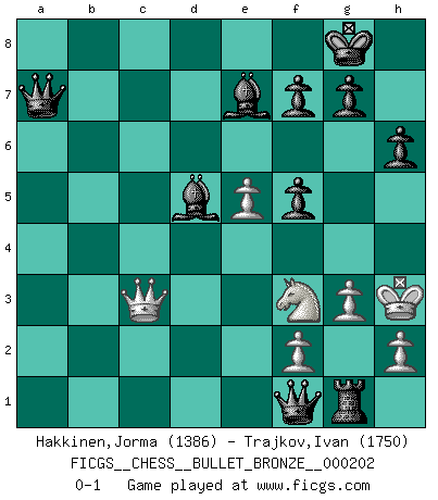 Last move : 0-1 2010 April 12 22:38:34 [Event "FICGS__CHESS__BULLET_BRONZE__000202"] [Site "FICGS"] [Date "2010.04.12"] [Round "1"] [White "Hakkinen,Jorma"] [Black "Trajkov,Ivan"] [Result "0-1"] [WhiteElo "1386"] [BlackElo "1750"] 1.d4 d5 2.c4 dxc4 3.Nc3 c6 4.Nf3 Nf6 5.Bg5 b5 6.e3 Nfd7 7.a3 h6 8.Bh4 Nf6 9.Bxf6 exf6 10.g3 Be7 11.Bg2 a6 12.O-O O-O 13.Qc2 Be6 14.Rfe1 Nd7 15.Rad1 Nb6 16.e4 Qd7 17.e5 f5 18.Re2 a5 19.Red2 b4 20.d5 cxd5 21.axb4 axb4 22.Ne2 Ra2 23.Qb1 Rfa8 24.b3 cxb3 25.Rxa2 bxa2 26.Qa1 b3 27.Nc3 Nc4 28.Nxa2 Rxa2 29.Qc3 Qa7 30.Nd4 b2 31.Bf1 Ra1 32.Bxc4 Rxd1+ 33.Kg2 b1Q 34.Bxd5 Bxd5+ 35.Nf3 Rg1+ 36.Kh3 Qf1+ 0-1 Queen's gambit accepted Kingside Castling by player White (move 12) Kingside Castling by player Black (move 12) Promotion Queen by player Black (move 33) Player Black won this chess game. Follow this game move after move (download)When you see a good move, look for a better one. (Emanuel Lasker) Du musst Deinen Gegner in einen tiefen dunklen Wald führen wo 2+2=5 ist und wo der Weg, der wieder hinausführt, nur breit genug für einen ist. (Mikhail Nekhemyevich Tal) En el Ajedrez, tal como en la vida, las bendiciones de hoy pueden ser el veneno del mañana. (Assaic) Assurément je connaissais par expérience le mystérieux attrait de ce jeu royal, le seul entre tous les jeux inventés par les hommes qui échappe souverainement à la tyrannie du hasard, le seul où l'on ne doive sa victoire qu'à son intelligence ou plutôt à une certaine forme d'intelligence. Mais n'est-ce pas déjà le limiter injurieusement que d'appeler les échecs un jeu ? N'est-ce pas une science, un art ou quelque chose qui, comme le cercueil de Mahomet entre ciel et terre, est suspendu entre l'un et l'autre, et qui réunit un nombre incroyable de contraires ? [...] C'est une pensée qui ne mène à rien, une mathématique qui n'établit rien, un art qui ne laisse pas d'uvre, une architecture sans matière; et il l'a prouvé néanmoins qu'il était plus durable, à sa manière, que les livres ou que tout autre monument, ce jeu unique qui appartient à tous les peuples et à tous les temps, et dont personne ne sait quel dieu en fit don à la terre pour tuer l'ennui, pour aiguiser l'esprit et stimuler l'âme. Où commence-t-il, où finit-il ? (Stefan Zweig) There will be no order, only chaos. (Sol Robeson in Pi by Darren Aronofsky)