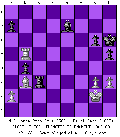 Last move : 1/2-1/2 2009 November 5 9:29:57 [Event "FICGS__CHESS__THEMATIC_TOURNAMENT__000089"] [Site "FICGS"] [Date "2009.08.25"] [Round "1"] [White "d Ettorre,Rodolfo"] [Black "Batal,Jean"] [Result "1/2-1/2"] [WhiteElo "1950"] [BlackElo "1697"] 1.e4 e5 2.Nf3 Nc6 3.c3 d6 4.Bb5 Bd7 5.d4 Nf6 6.Nbd2 Be7 7.O-O O-O 8.Re1 Nxd4 9.Nxd4 exd4 10.Bxd7 dxc3 11.Ba4 cxd2 12.Bxd2 Nd7 13.f4 Bf6 14.e5 dxe5 15.Bb4 c5 16.Bxd7 cxb4 17.fxe5 Bh4 18.g3 Be7 19.Qd5 Rc8 20.e6 f5 21.Qxb7 Rc2 22.Rec1 Rxb2 23.Rc8 Qa5 24.Rxf8+ Bxf8 25.Bb5 h6 26.Qf7+ Kh7 27.Qxf5+ g6 28.Qf7+ Bg7 29.Bd3 Qh5 30.h3 Qg5 31.Qf4 Qd5 32.Qe4 Qxe4 33.Bxe4 Re2 34.Bd3 Rxe6 35.Rd1 h5 36.Kg2 Kh6 37.Bc4 Rc6 38.Bb3 Rc3 39.Rd5 Bf6 40.Rb5 Be7 1/2-1/2 Ponziani Opening Kingside Castling by player White (move 7) Kingside Castling by player Black (move 7) This chess game ended in a draw. Follow this game move after move (download)Do you realize Fischer almost never has any bad pieces? He exchanges them, and the bad pieces remain with his opponents. (Yuri Balashov) Die Elozahlen sind sehr schlecht für das Schach. Jetzt ist Schach eine Sportindustrie, die darauf zielt Elopunkte zu machen. (Miguel Najdorf) No hay un Gran Maestro de Ajedrez que sea normal; solo se diferencían ellos por la magnitud de su locura. (Viktor Korchnoi) Votre prénom est 'Tactique', votre deuxième prénom est 'Tactique' et votre nom est 'Tactique'. (Ken Smith) I'm extremely disappointed. I send you out for exciting, new designer drugs, you come back with tomato sauce. (Gregory House, House M.D.)
