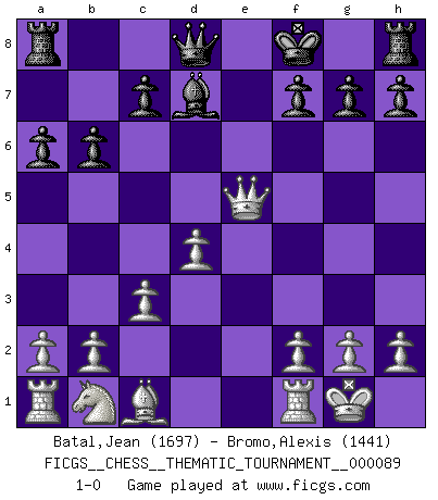 Last move : 1-0 2009 September 4 18:39:34 [Event "FICGS__CHESS__THEMATIC_TOURNAMENT__000089"] [Site "FICGS"] [Date "2009.08.25"] [Round "1"] [White "Batal,Jean"] [Black "Bromo,Alexis"] [Result "1-0"] [WhiteElo "1697"] [BlackElo "1441"] 1.e4 e5 2.Nf3 Nc6 3.c3 d5 4.Qa4 Bd7 5.exd5 Nce7 6.Qb3 b6 7.Bc4 Nf6 8.d6 Ned5 9.Bxd5 Nxd5 10.Qxd5 Bxd6 11.O-O Be6 12.Qb5+ Bd7 13.Qe2 a6 14.Nxe5 Bxe5 15.Qxe5+ Kf8 16.d4 1-0 Ponziani : Caro variation Kingside Castling by player White (move 11) Player White won this chess game. Follow this game move after move (download)It began to feel as though you were playing against Chess itself. - On playing against Robert Fischer. (Walter Shipman) Das Zentrum ist der Balkan des Schachbretts - Kriegshandlungen können in jedem Moment ausbrechen. (Aaron Nimzowitsch) La vida es como el Ajedrez, con lucha, competición y eventos buenos y malos. (Benjamin Franklin) Que feriez-vous si vous étiez en train de jouer aux échecs et que la fin du monde arrive ? Je continuerais à jouer. (Saint Borromée) Children in the dark cause accidents, accidents in the dark cause children. (Unknown)