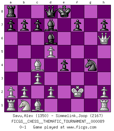Last move : 0-1 2009 August 29 21:18:56 [Event "FICGS__CHESS__THEMATIC_TOURNAMENT__000089"] [Site "FICGS"] [Date "2009.08.25"] [Round "1"] [White "Savu,Alex"] [Black "Simmelink,Joop"] [Result "0-1"] [WhiteElo "1350"] [BlackElo "2167"] 1.e4 e5 2.Nf3 Nc6 3.c3 d5 4.Qa4 Bd7 5.exd5 Nd4 6.Qd1 Nxf3+ 7.Qxf3 Nf6 8.Bc4 e4 9.Qg3 Bd6 10.Qxg7 Rg8 11.Qh6 Rxg2 12.Kf1 Rxf2+ 13.Kxf2 Ng4+ 0-1 Ponziani : Caro variation Player Black won this chess game. Follow this game move after move (download)A good player is always lucky. (Jose Raul Capablanca) Ich könnte leicht behaupten: Ja,ja, Leonid Breschnew wollte nicht, daß ich Weltmeister werde. In der Tat war die Sache komplizierter. (Viktor Kortschnoi) El Ajedrez no es como la vida... ¡tiene reglas!. (Mark Pasternak) Les réformistes prétendent que les progrès de la théorie conduiront à la disparition des échecs, et qu'il faut, pour leur rendre vie, en remanier les règles. En réalité, qu'exprime cette affirmation? Le mépris de l'intuition, de l'imagination et de tous les autres éléments qui font des échecs un art. (Alexander Alekhine) Men should grow up. - Yeah. And dogs should stop licking themselves. It's not gonna happen. (Gregory House to Dr. Cameron, House M.D.)