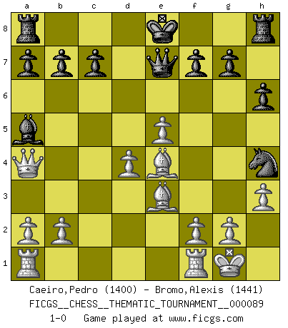 Last move : 1-0 2009 August 30 6:37:13 [Event "FICGS__CHESS__THEMATIC_TOURNAMENT__000089"] [Site "FICGS"] [Date "2009.08.25"] [Round "1"] [White "Caeiro,Pedro"] [Black "Bromo,Alexis"] [Result "1-0"] [WhiteElo "1400"] [BlackElo "1441"] 1.e4 e5 2.Nf3 Nc6 3.c3 Bc5 4.d4 exd4 5.cxd4 Bb4+ 6.Nc3 d5 7.e5 Bg4 8.Be2 h6 9.O-O Nge7 10.h3 Bxf3 11.Bxf3 Ng6 12.Nxd5 Ba5 13.Be3 Nh4 14.Be4 Ne7 15.Nxe7 Qxe7 16.Qa4+ 1-0 Ponziani Opening Kingside Castling by player White (move 9) Player White won this chess game. Follow this game move after move (download)Modern Chess is too much concerned with things like Pawn structure. Forget it, Checkmate ends the game. (Nigel Short) Stil? Ich habe keinen Stil! (Anatoly Karpov) Una mala movida nulifica cuarenta buenas. (Horowitz) Le profane ne songe pas à la somme de jouissance dont il se prive, qui méconnaît ce jeu aux ressources aussi variées que passionnantes. (Jean-Marie Jeanton-Lamarche) It is not titles that honor men, but men that honor titles. (Niccolo Machiavelli)
