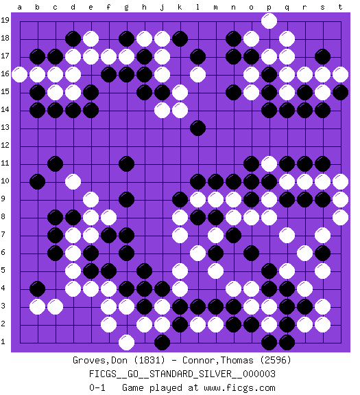 Last move : 0-1 2010 January 18 15:31:30 [Event "FICGS__GO__STANDARD_SILVER__000003"] [Site "FICGS"] [Date "2009.08.26"] [Round "1"] [Black "Groves,Don"] [White "Connor,Thomas"] [Result "0-1"] [Rating 1 "1831"] [Rating 2 "2596"] 1.p16 d4 2.p4 d17 3.d14 c15 4.c14 d15 5.e14 d10 6.c6 f4 7.b4 c3 8.c8 e9 9.b10 j3 10.g11 r16 11.r15 s15 12.r14 q16 13.p15 p17 14.o17 o18 15.p18 q17 16.n18 o16 17.n17 q18 18.q9 f17 19.s14 r4 20.r5 s5 21.s6 q5 22.m3 r6 23.o6 j16 24.g9 e7 25.e6 f6 26.f7 f8 27.g7 d6 28.e5 d7 29.f5 g5 30.g6 d5 31.g4 e4 32.h5 g3 33.h3 h2 34.h4 j2 35.g2 f3 36.n15 k5 37.c7 k7 38.k9 j14 39.q3 s7 40.s9 l9 41.l8 k8 42.l10 m9 43.m8 n8 44.m10 n9 45.n10 p8 46.s17 s16 47.n7 m7 48.m6 l6 49.o9 o8 50.b15 b16 51.b14 p9 52.p10 o10 53.o11 q10 54.o9 r10 55.r9 p11 56.o10 s10 57.q11 t9 58.r11 t8 59.s11 t10 60.h17 j17 61.t15 t16 62.g16 h18 63.g18 g17 64.h16 j18 65.f16 e17 66.b17 a16 67.e15 d16 68.c11 r2 69.r3 s3 70.q2 b3 71.k3 p19 72.j15 k15 73.h15 k14 74.l13 q15 75.q14 o15 76.p14 m5 77.d8 e8 78.c17 c16 79.d18 e18 80.l17 l16 81.k18 n4 82.n3 o4 83.p5 o3 84.o2 p3 85.q4 p2 86.p1 s2 87.j4 k4 88.k2 g1 89.q1 l2 90.j1 f2 91.l3 m2 92.n2 q7 0-1 Here are the names of the openings (joseki) played in the four corners : Corner d16 : d17 d14 Komoku (Somok, Xiao~mu`) 3-4 Point. The komoku (3-4) point is the traditional corner enclosure move.. Nikken Takagakari (Dukan Nop'dakeolch'im, E`r Gaojia, 2-Space High Approch). The great master Honinbo Shuei (1852-1906) favored the two-space high (niken taka-gakari) approach, especially in two stone handicap games. This approach move was very popular in the 1910s. Wu Qingyuan = Go Seigen frequently played this way, considering it a good "whole board" approach. In recent years, O Rissei has often used the two-space high approach. Corner d4 : d4 c6 Hoshi (Hwajeom, Seongjeom, Xingwei`) 4-4 Point. The star or hoshi (4-4) point, emphasizing influence at the potential expense of territory. Ikken Kakari (Hankan Keolch'im, Yi Gua`jiao~, 1-Space Low Approach). Black 2 is the standard approach move to the 4-4. Corner q16 : p16 r16 Takamoku (Gomok, Gaomu`) 5-4 Point. The takamoku (high) point (5-4). With its emphasis on influence, the 5-4 point complements the 4-4 (hoshi) point in creating an influence-oriented fuseki. Komoku. Black responds with 3-3, 3-5, 4-6, 4-7, 3-6, 3-7. Player White won this Go (weiqi, baduk) game. Follow this game move after move (download)The intersection is rarely neutral. (Pierre Audouard) If I had no sense of humor, I would long ago have committed suicide. (Mahatma Gandhi)