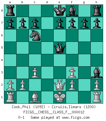 Last move : 0-1 2006 November 18 4:30:17 [Event "FICGS__CHESS__CLASS_F__000012"] [Site "FICGS"] [Date "2006.09.23"] [Round "1"] [White "Cook,Phil"] [Black "Cirulis,Ilmars"] [Result "0-1"] [WhiteElo "1092"] [BlackElo "1200"] 1.e4 Nc6 2.d4 d5 3.Nc3 Nf6 4.e5 Ne4 5.Nxe4 dxe4 6.Bc4 Qxd4 7.Bb5 Qb4+ 8.c3 Qxb5 9.Qe2 Qxe5 10.Nf3 exf3 11.gxf3 Bh3 0-1 KP : Nimzovich defense, Bogolyubov variation Player Black won this chess game. Follow this game move after move (download)The combination player thinks forward; he starts from the given position, and tries the forceful moves in his mind. (Emanuel Lasker) Verschiedene, sehr schätzbare und im Laufe des Lebens nützliche Eigenschaften des Geistes können durch das Schachspiel erworben und gekräftigt werden, so dass sie zu Gewohnheiten werden, die uns nie im Stich lassen. (Benjamin Franklin) Vive, pierde y aprende al observar a tu oponente como ganar. (Amber Steenbock) Tous ces prétendus hommes politiques sont les pions, les Cavaliers, les Tours ou les Fous d'une partie d'échecs qui se jouera tant qu'un hasard ne renversera pas l'échiquier. (Honoré de Balzac) Fortune favours the audacious. (Desiderius Erasmus)
