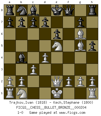 Last move : 1-0 2010 April 13 8:55:42 [Event "FICGS__CHESS__BULLET_BRONZE__000204"] [Site "FICGS"] [Date "2010.04.13"] [Round "1"] [White "Trajkov,Ivan"] [Black "Kech,Stephane"] [Result "1-0"] [WhiteElo "1818"] [BlackElo "1800"] 1.e4 Nf6 2.e5 Ng4 3.Qxg4 e6 4.d4 f5 5.exf6 Qxf6 6.Bg5 Qg6 7.Bd3 Qf7 8.Nf3 h6 9.Ne5 h5 10.Qe2 Bb4+ 11.c3 Qf8 12.Bg6+ 1-0 This chess game has been lost on time (started : 2010.04.13 0:14:47) Alekhine's defense Player White won this chess game. Follow this game move after move (download)On the chessboard, lies and hypocrisy do not survive long. (Emanuel Lasker) Mein Name ist Rustam Kamsky. Sie haben meinen Sohn belästigt. Bereiten Sie sich aufs Sterben vor. (Rustam Kamsky) Yo siempre he tenido un ligero sentimiento de lástima por una persona que no tiene conocimiento del Ajedrez. (Siegbert Tarrasch) Je crois qu'il existe des manières très spécifiques de jouer efficacement contre une machine. Evidemment, nous n'avons aucune chance en technique pure, parce que l'ordinateur calcule de manière parfaite. Mais lorsque nous faisons appel à notre cerveau, en utilisant l'intuition et la compréhension, alors nous restons beaucoup plus forts. (Anatoli Karpov) The best teachers teach from the heart, not from the book. (Author unknown)