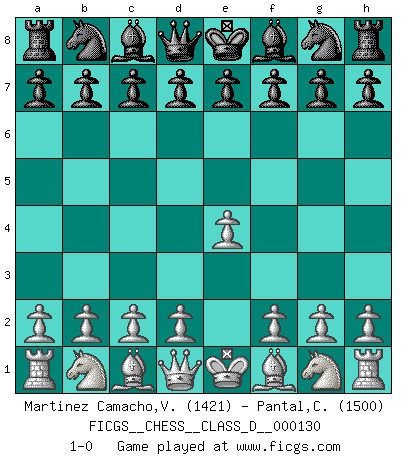 Last move : 1-0 2009 October 6 21:4:0 [Event "FICGS__CHESS__CLASS_D__000130"] [Site "FICGS"] [Date "2009.08.27"] [Round "1"] [White "Martinez Camacho,Victor Hugo"] [Black "Pantal,Conrad"] [Result "1-0"] [WhiteElo "1421"] [BlackElo "1500"] 1.e4 1-0 This chess game has been lost on time (started : 2009.08.27 7:46:49) King's pawn Opening Player White won this chess game. Follow this game move after move (download)I have added these principles to the law: get the Knights into action before both Bishops are developed. (Emanuel Lasker) Schach ist eine Sache der genauen Beurteilung, wann man zuschlagen und wann man sich ducken muss. (Robert James Fischer) Aún deseo matar a Fischer. (Boris Spassky) Le succès, c'est être capable d'aller d'échec en échec sans perdre son enthousiasme. (Winston Churchill) Tomorrow's what you make of it. (Horatio Caine, C.S.I. Miami)