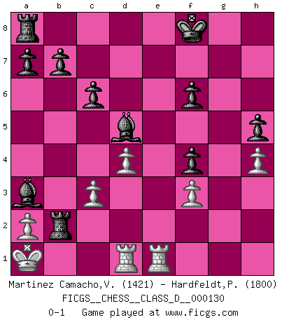 Last move : 0-1 2009 October 9 18:0:2 [Event "FICGS__CHESS__CLASS_D__000130"] [Site "FICGS"] [Date "2009.08.27"] [Round "1"] [White "Martinez Camacho,Victor Hugo"] [Black "Hardfeldt,Pan"] [Result "0-1"] [WhiteElo "1421"] [BlackElo "1800"] 1.e4 c6 2.d4 d5 3.Nd2 dxe4 4.Nxe4 Nf6 5.Nxf6+ gxf6 6.Bc4 Rg8 7.g3 Bg4 8.f3 Bf5 9.c3 e6 10.Bf4 Nd7 11.Qb3 Nb6 12.Be2 Qe7 13.g4 Bg6 14.h4 h5 15.g5 fxg5 16.Bxg5 f6 17.Bf4 Bf7 18.Bd3 e5 19.Qa3 Qxa3 20.bxa3 exf4 21.O-O-O Bxa3+ 22.Kb1 Kf8 23.Ne2 Nd5 24.Be4 Rg2 25.Rhe1 Rxe2 26.Bxd5 Rb2+ 27.Ka1 Bxd5 0-1 Caro-Kann : 3.Nd2 Queenside Castling by player White (move 21) Player Black won this chess game. Follow this game move after move (download)Let the perfectionist play postal. (Yasser Seirawan) Mutter, ich bin eben Ex-Weltmeister geworden. --beim nach Hause Kommen nach dem Verlust des WM-Titels an Mihail Botvinnik -- (Mikhail Nekhemyevich Tal) Hay dos clases de hombres: aquellos que se conforman en dejarse llevar por las circunstancias y que juegan barajas y aquellos decididos a controlar las circunstancias y que juegan al Ajedrez. (Mortimer Collins) Aidez vos pièces, elles vous aideront. (Paul Morphy) Unless I accept my faults I will most certainly doubt my virtues. (Hugh Prather)