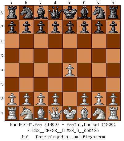 Last move : 1-0 2009 October 7 21:12:31 [Event "FICGS__CHESS__CLASS_D__000130"] [Site "FICGS"] [Date "2009.08.27"] [Round "1"] [White "Hardfeldt,Pan"] [Black "Pantal,Conrad"] [Result "1-0"] [WhiteElo "1800"] [BlackElo "1500"] 1.e4 1-0 This chess game has been lost on time (started : 2009.08.27 7:46:49) King's pawn Opening Player White won this chess game. Follow this game move after move (download)Best by test: 1. e4 (Bobby Fischer) Oft bringt ein stiller Zug das Erdbeben. (Richard Reti) El Jaque al descubierto es el bombardero del tablero. (Reuben Fine) Il a essayé de se convaincre qu'il pourrait empêcher toutes les erreurs et ne jamais perdre. L'horreur ! Gary Kasparov au sujet de Robert Fischer. Warrior pose battles inner weakness and wins focus. You see that there is no war within you. You're on your own side, and you are your own strength. (Terri Guillemets)