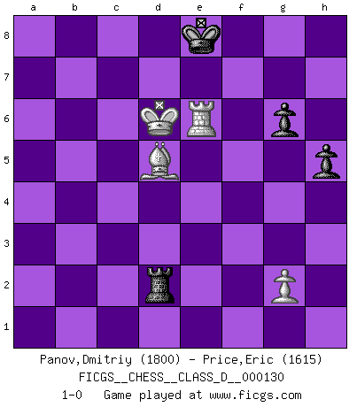 Last move : 1-0 2009 October 26 22:7:52 [Event "FICGS__CHESS__CLASS_D__000130"] [Site "FICGS"] [Date "2009.08.27"] [Round "1"] [White "Panov,Dmitriy"] [Black "Price,Eric"] [Result "1-0"] [WhiteElo "1800"] [BlackElo "1615"] 1.e4 e5 2.Nf3 Nc6 3.Bc4 Nf6 4.Ng5 d5 5.exd5 Na5 6.Bb5+ c6 7.dxc6 bxc6 8.Be2 h6 9.Nf3 e4 10.Ne5 Qd4 11.Ng4 Bxg4 12.Bxg4 Bc5 13.O-O O-O 14.c3 Qe5 15.d4 exd3 16.Re1 Bxf2+ 17.Kxf2 Qxh2 18.Bf3 Qh4+ 19.Kg1 Nc4 20.Na3 Rae8 21.Bd2 Ne5 22.Rxe5 Rxe5 23.Be1 Qf4 24.Qxd3 Rfe8 25.Bf2 Rg5 26.Qd1 Ne4 27.Qe2 Rge5 28.Qe3 Qxe3 29.Bxe3 Nxc3 30.Nc4 Rxe3 31.Nxe3 Rxe3 32.bxc3 Rxc3 33.Rb1 g6 34.Rb7 Ra3 35.Bxc6 Rxa2 36.Bd5 Ra6 37.Rxf7 Kh8 38.Kf2 Rd6 39.Be4 Kg8 40.Rxa7 Kh8 41.Kf3 Kg8 42.Kf4 Rb6 43.Ke5 Kf8 44.Bd5 h5 45.Rf7+ Ke8 46.Rf6 Rb2 47.Kd6 Rd2 48.Re6+ 1-0 Two knights defense Kingside Castling by player White (move 13) Kingside Castling by player Black (move 13) 10 pieces endgame at move 35 : White KRBP , Black KRPPPP WHITE : King + 1 Rook 1 Bishop 1 Pawn BLACK : King + 1 Rook 4 Pawns 9 pieces endgame at move 37 : White KRBP , Black KRPPP WHITE : King + 1 Rook 1 Bishop 1 Pawn BLACK : King + 1 Rook 3 Pawns 8 pieces endgame at move 40 : White KRBP , Black KRPP WHITE : King + 1 Rook 1 Bishop 1 Pawn BLACK : King + 1 Rook 2 Pawns Player White won this chess game. Follow this game move after move (download)Bobby Fischer is the greatest Chess genius of all time ! (Alexander Kotov) Ich hatte Zahnschmerzen im ersten Spiel. In der zweiten Partie tat mir der Kopf weh. In der dritten war es eine Rheuma-Attacke und während der vierten fühlte ich mich nicht gut. Und in der fünften? Nun, man muss doch nicht jedes Spiel gewinnen, oder? (Savielly Grigorievitsch Tartakower) Aún el Rey más flojo huye despavorido ante la amenaza de un Jaque doble. (Aaron Nimzowitsch) Les Echecs représentent une sphère d'idées créatrices basée sur la volonté des deux protagonistes. (Smyslov) There is a very easy way to return from a casino with a small fortune : go there with a large one. (Jack Yelton)