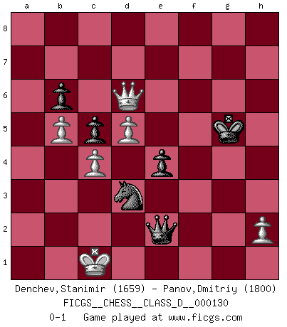 Last move : 0-1 2009 December 8 10:3:51 [Event "FICGS__CHESS__CLASS_D__000130"] [Site "FICGS"] [Date "2009.08.27"] [Round "1"] [White "Denchev,Stanimir"] [Black "Panov,Dmitriy"] [Result "0-1"] [WhiteElo "1659"] [BlackElo "1800"] 1.d4 Nf6 2.Nf3 e6 3.c4 b6 4.Nc3 Bb4 5.Bg5 O-O 6.e3 Bb7 7.Bd3 h6 8.Bh4 d6 9.O-O Bxc3 10.bxc3 Nbd7 11.Nd2 Qe7 12.e4 e5 13.Qe2 Rae8 14.f3 Bc8 15.a4 g5 16.Bg3 Nh5 17.a5 Nf4 18.Bxf4 gxf4 19.axb6 axb6 20.Ra7 Qf6 21.Nb3 c5 22.d5 Kh7 23.Rfa1 Rg8 24.Qc2 Rg7 25.Bf1 Reg8 26.Rc7 Qd8 27.R1a7 f6 28.Nd2 Nf8 29.Rxg7+ Rxg7 30.Rxg7+ Kxg7 31.Nb1 Bd7 32.Na3 Qa8 33.Qb2 Qa5 34.Nb5 Bxb5 35.cxb5 h5 36.g3 Ng6 37.c4 Qe1 38.Qf2 Qa1 39.Kg2 Qc1 40.g4 hxg4 41.fxg4 f3+ 42.Kxf3 Qf4+ 43.Kg2 Qxg4+ 44.Qg3 Qxe4+ 45.Kg1 f5 46.Bd3 Qd4+ 47.Kf1 e4 48.Be2 f4 49.Qg4 f3 50.Qd7+ Kh6 51.Qh3+ Kg5 52.Qg3+ Kf5 53.Qh3+ Kf6 54.Qe6+ Kg5 55.Qxd6 fxe2+ 56.Kxe2 Nf4+ 57.Ke1 Qe3+ 58.Kd1 Qe2+ 59.Kc1 Nd3+ 0-1 Queen's pawn game Kingside Castling by player Black (move 5) Kingside Castling by player White (move 9) Player Black won this chess game. Follow this game move after move (download)The older I grow, the more I value pawns. (Paul Keres) Ich spiele 70 Eröffnungssysteme. (Viktor Kortschnoi) Robert Fischer es la ley hacia si mismo. (Larry Evans) Botvinnik disait en comparant les échecs à la musique: Il existe une science dont le but est l'étude de l'acoustique et des sons. Mais il y a aussi un art qui se sert de l'océan des sons : c'est la musique. De toute évidence, il en est de même pour la pensée. La logique est l'étude des lois de la réflexion et les échecs reflètent, en tant qu'art, le côté logique de la réflexion, sous la forme d'images artistiques... Extrait de Fischer - Spassky, Reykjavik 1972 par Alexander & F. Wyndham (Ed. Solar), p 37. A proverb is a short sentence based on long experience. (Miguel de Cervantes)