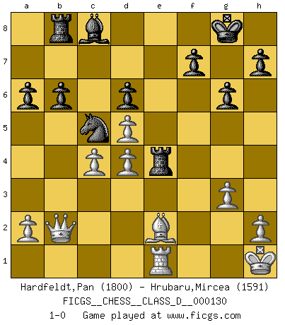 Last move : 1-0 2009 October 17 17:52:59 [Event "FICGS__CHESS__CLASS_D__000130"] [Site "FICGS"] [Date "2009.08.27"] [Round "1"] [White "Hardfeldt,Pan"] [Black "Hrubaru,Mircea"] [Result "1-0"] [WhiteElo "1800"] [BlackElo "1591"] 1.e4 e5 2.Nc3 Bb4 3.Nd5 Ba5 4.b4 c6 5.bxa5 cxd5 6.exd5 Nf6 7.c4 Qxa5 8.Nf3 O-O 9.Be2 d6 10.O-O e4 11.Nd4 Qb6 12.Nb5 a6 13.Nc3 Nbd7 14.Rb1 Qc7 15.Qb3 Rb8 16.Ba3 b6 17.f3 exf3 18.Bxf3 Nc5 19.Qc2 g6 20.Be2 Qe7 21.Rbe1 Re8 22.Qc1 Qe5 23.Bb2 Qd4+ 24.Kh1 Qh4 25.g3 Qg5 26.Rxf6 Qxf6 27.Ne4 Qxb2 28.Qxb2 Rxe4 29.d4 1-0 Vienna game Kingside Castling by player Black (move 8) Kingside Castling by player White (move 10) Player White won this chess game. Follow this game move after move (download)In Chess, as it is played by masters, chance is practically eliminated. (Emanuel Lasker) In Buenos Aires ist es nicht mein vorrangiges Ziel ein starkes Turnier zu organisieren, sondern ein Turnier für Gentlemen. Ich würde nie Kamsky einladen. Ich mag keine Probleme. (Miguel Najdorf) No nos podemos resistir a la fascinación de un sacrificio ya que la pasión por los sacrificios es parte de la naturaleza de un jugador de Ajedrez. (Rudolf Spielman) Le succès, c'est être capable d'aller d'échec en échec sans perdre son enthousiasme. (Winston Churchill) Wisdom is the reward you get for a lifetime of listening when you'd have preferred to talk. (Doug Larson)