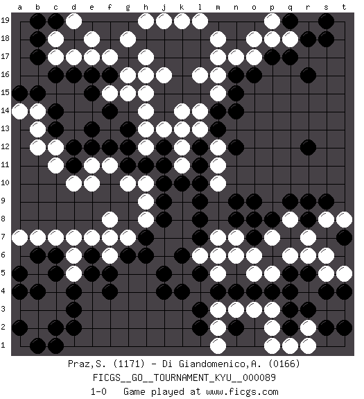 Last move : 1-0 2010 March 17 15:2:25 [Event "FICGS__GO__TOURNAMENT_KYU__000089"] [Site "FICGS"] [Date "2009.08.27"] [Round "1"] [Black "Praz,Sylvain"] [White "Di Giandomenico,Alfonso"] [Result "1-0"] [Rating 1 "1171"] [Rating 2 "0166"] 1.r16 c17 2.q3 c3 3.p17 k17 4.r9 d10 5.d4 c4 6.d3 d5 7.e5 d6 8.e6 e7 9.k4 o17 10.o16 n17 11.n16 m16 12.f4 f8 13.d16 d17 14.e16 e17 15.d12 c12 16.c13 c11 17.e13 e11 18.f16 f17 19.j14 j13 20.n14 h13 21.f12 f11 22.g12 h12 23.g11 g10 24.h11 h14 25.j15 h15 26.h16 h17 27.k16 g16 28.j17 j16 29.j18 h16 30.l17 l16 31.k15 m17 32.l18 l14 33.l15 m15 34.k18 m18 35.h18 g18 36.m14 k14 37.k17 l19 38.q5 h19 39.l12 j19 40.k10 k19 41.j8 h8 42.h7 g7 43.h6 h9 44.j9 p18 45.q17 q18 46.r18 r19 47.q19 p19 48.c16 b13 49.c14 b14 50.b15 a14 51.s18 k11 52.j11 k12 53.l11 l13 54.m13 m12 55.n12 m11 56.l10 m10 57.n15 k9 58.l9 k8 59.l8 k7 60.g6 j7 61.j10 j6 62.j5 m7 63.l7 f6 64.f5 f7 65.c2 b2 66.d2 b3 67.n9 l6 68.n4 k5 69.j4 m5 70.k6 n6 71.l5 m6 72.m4 m3 73.l3 m2 74.l2 o3 75.o4 p3 76.q2 p2 77.p4 p1 78.n2 n3 79.b17 m1 80.b18 c18 81.s19 o18 82.r12 r6 83.r5 q6 84.p8 o8 85.o9 p7 86.o7 q8 87.n8 o6 88.r8 r7 89.q9 s5 90.s4 r4 91.r3 s3 92.t4 t3 93.q4 r2 94.s2 q1 95.b1 r1 96.d11 e10 97.a2 a3 98.c1 b12 99.c5 b5 100.c6 d7 101.b6 c7 102.a5 b7 103.b4 a7 104.a4 h10 105.e12 s8 106.s9 t8 107.c19 d19 108.b19 e18 109.a15 t5 110.t2 s6 111.t7 o5 112.j12 k13 113.f14 f15 114.e15 g15 115.g13 p5 116.q19 n7 117.o8 1-0 Here are the names of the openings (joseki) played in the four corners : Corner d4 : c3 d4 San-San (Sam-Sam, San-San) 3-3 Point. The San-San (3-3) point, emphasizing territory at the expense of influence. Kata-tsuki (shoulder hit). The shoulder-hit is the traditional answer to the 3-3. The direction of White 3 depends on the positions on the side. Crawling once may be the premise for a follow-up move of sliding with a knight's move in the opposite direction. If White plays 3 at 3-4 (to the right), the follow-on knight's move is then played at the top (e.g. 3-4, 4-5, 5-2). White's knight's move reduces territory potential on the side it is played. Corner d16 : c17 d16 San-San (Sam-Sam, San-San) 3-3 Point. The San-San (3-3) point, emphasizing territory at the expense of influence. Kata-tsuki (shoulder hit). The shoulder-hit is the traditional answer to the 3-3. The direction of White 3 depends on the positions on the side. Crawling once may be the premise for a follow-up move of sliding with a knight's move in the opposite direction. If White plays 3 at 3-4 (to the right), the follow-on knight's move is then played at the top (e.g. 3-4, 4-5, 5-2). White's knight's move reduces territory potential on the side it is played. Player Black won this Go (weiqi, baduk) game. Follow this game move after move (download)The nature of a game comes from what is played, but it's the sensitivity to the possible and the impossible that gives it value. (Pierre Audouard) Perception is reality. (Immanuel Kant)