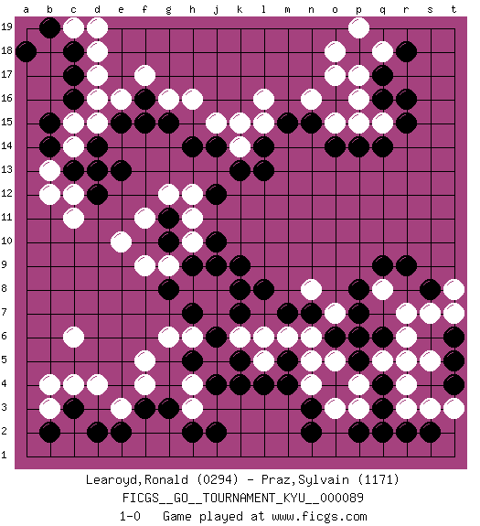 Last move : 1-0 2009 October 22 0:56:7 [Event "FICGS__GO__TOURNAMENT_KYU__000089"] [Site "FICGS"] [Date "2009.08.27"] [Round "1"] [Black "Learoyd,Ronald"] [White "Praz,Sylvain"] [Result "1-0"] [Rating 1 "0294"] [Rating 2 "1171"] 1.q16 d4 2.q3 d17 3.r9 o17 4.q14 l16 5.f3 c6 6.k4 d15 7.p18 p17 8.q17 o18 9.n15 o15 10.o14 n16 11.m15 l15 12.l14 j15 13.c13 c11 14.b15 d13 15.d12 c12 16.d14 c14 17.e13 b13 18.d13 c15 19.e15 e16 20.f15 g16 21.f16 f17 22.g15 h16 23.j14 q5 24.o4 r3 25.r2 r4 26.s2 s3 27.p8 r7 28.p6 f5 29.d2 h3 30.c3 e10 31.g10 f11 32.g11 k14 33.k13 k15 34.l13 j7 35.k9 l6 36.m4 j5 37.j4 h4 38.j2 g12 39.h14 h12 40.j12 h11 41.j10 h10 42.h9 g9 43.g8 f9 44.h7 j8 45.j9 h8 46.l8 p15 47.p14 c4 48.h2 e3 49.e2 f4 50.g3 q15 51.r15 q18 52.r18 p19 53.b14 b12 54.c16 d16 55.c17 d18 56.c18 c19 57.b19 d19 58.a18 n8 59.m7 l5 60.l4 n5 61.n7 o7 62.p7 n6 63.o6 n4 64.n3 o5 65.p5 p4 66.q4 p3 67.q2 o3 68.n2 r5 69.s8 s7 70.t5 s5 71.t4 t3 72.t6 t7 73.q6 r6 74.p2 q8 75.q9 p16 76.r16 b3 77.b2 b4 78.k5 k6 79.h5 h6 80.j6 g6 81.k7 j5 82.m5 m6 83.j6 t8 84.k8 1-0 Here are the names of the openings (joseki) played in the four corners : Corner q16 : q16 o17 Hoshi (Hwajeom, Seongjeom, Xingwei`) 4-4 Point. The star or hoshi (4-4) point, emphasizing influence at the potential expense of territory. Ikken Kakari (Hankan Keolch'im, Yi Gua`jiao~, 1-Space Low Approach). White 2 is the standard approach move to the 4-4. Corner d4 : d4 f3 Hoshi (Hwajeom, Seongjeom, Xingwei`) 4-4 Point. The star or hoshi (4-4) point, emphasizing influence at the potential expense of territory. Ikken Kakari (Hankan Keolch'im, Yi Gua`jiao~, 1-Space Low Approach). Black 2 is the standard approach move to the 4-4. Player Black won this Go (weiqi, baduk) game. Follow this game move after move (download)For rectangular six in the corner, dame is necessary. (Anonymous) The Internet isn't free. It just has an economy that makes no sense to capitalism. (Brad Shapcott)