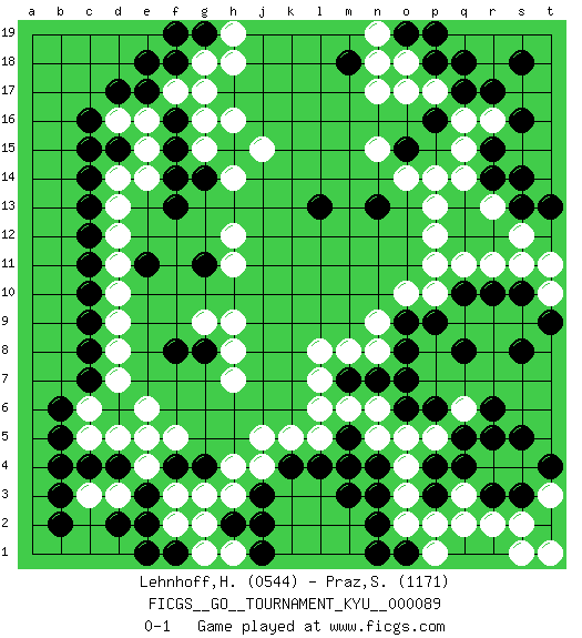 Last move : 0-1 2010 February 16 14:34:22 [Event "FICGS__GO__TOURNAMENT_KYU__000089"] [Site "FICGS"] [Date "2009.08.27"] [Round "1"] [Black "Lehnhoff,Heinz-Georg"] [White "Praz,Sylvain"] [Result "0-1"] [Rating 1 "0544"] [Rating 2 "1171"] 1.d4 q16 2.c16 e16 3.q4 d14 4.c14 d13 5.c13 d12 6.e17 f17 7.d17 g16 8.r14 n17 9.r17 r16 10.s16 q14 11.r15 q15 12.k4 c6 13.c10 d10 14.c12 d9 15.n3 r13 16.q17 p17 17.c4 q6 18.q8 r4 19.r3 q3 20.p4 q2 21.r5 s4 22.r6 o10 23.s3 s2 24.t4 r2 25.s5 o2 26.q10 p11 27.n2 o3 28.g4 h7 29.p3 p2 30.t2 o4 31.n4 o5 32.o8 n8 33.n7 m8 34.o6 n5 35.m7 l7 36.p6 l6 37.m5 m6 38.l4 n6 39.o7 l8 40.f8 g9 41.p18 o18 42.p16 o17 43.s18 e6 44.c8 d8 45.c9 f5 46.f18 g18 47.f15 e15 48.o15 n15 49.q13 p13 50.q12 p14 51.s13 p12 52.f4 q11 53.r12 r11 54.r10 s11 55.s10 s12 56.f16 g17 57.f14 h14 58.h15 g15 59.g14 j15 60.d15 e14 61.c7 d7 62.b6 r13 63.s14 e4 64.e3 e5 65.q18 d3 66.b2 c3 67.b3 f3 68.e2 f2 69.d2 h4 70.j3 h3 71.e11 d11 72.m3 j5 73.h2 g2 74.j2 k5 75.e18 h16 76.g19 h19 77.f19 h18 78.o9 n9 79.c11 p5 80.q5 d16 81.c15 p10 82.p9 t10 83.t9 t11 84.s8 c5 85.b5 d5 86.b4 j4 87.o19 n19 88.p19 l5 89.m18 n18 90.o1 p1 91.n1 h1 92.j1 g1 93.m4 s1 94.e1 t1 95.f1 g3 96.g8 h8 97.f13 h9 98.g11 h11 99.l13 h12 100.n13 o14 101.t13 t3 0-1 Here are the names of the openings (joseki) played in the four corners : Corner d16 : c16 e16 Komoku (Somok, Xiao~mu`) 3-4 Point. The komoku (3-4) point is the traditional corner enclosure move.. Ikken Takagakari (Hankan Nop'dakeolch'im, Yi Gaogua`jiao~, 1-Space High Approach). The 5-4 approach move has become more popular in modern times, as modern Go emphasizes speed and influence. Corner q16 : q16 r14 Hoshi (Hwajeom, Seongjeom, Xingwei`) 4-4 Point. The star or hoshi (4-4) point, emphasizing influence at the potential expense of territory. Ikken Kakari (Hankan Keolch'im, Yi Gua`jiao~, 1-Space Low Approach). Black 2 is the standard approach move to the 4-4. Corner d4 : d4 c6 Hoshi (Hwajeom, Seongjeom, Xingwei`) 4-4 Point. The star or hoshi (4-4) point, emphasizing influence at the potential expense of territory. Ikken Kakari (Hankan Keolch'im, Yi Gua`jiao~, 1-Space Low Approach). White 2 is the standard approach move to the 4-4. Player White won this Go (weiqi, baduk) game. Follow this game move after move (download)The simplest move is the best move. (Anonymous) Humor is by far the most significant activity of the human brain. (Edward De Bono)