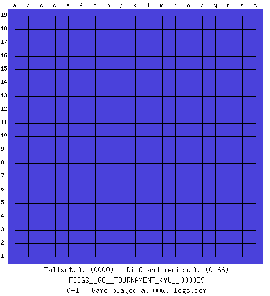 Last move : 0-1 2009 September 27 10:3:27 [Event "FICGS__GO__TOURNAMENT_KYU__000089"] [Site "FICGS"] [Date "2009.08.27"] [Round "1"] [Black "Tallant,Amber"] [White "Di Giandomenico,Alfonso"] [Result "0-1"] [Rating 1 "0000"] [Rating 2 "0166"] 0-1 This go game has been lost on time (started : 2009.08.27 22:18:53) Here are the names of the openings (joseki) played in the four corners : Player White won this Go (weiqi, baduk) game. Follow this game move after move (download)If you have won four corners, resign. (Anonymous) Internal peace cannot coexist with external war. (Don Groves)