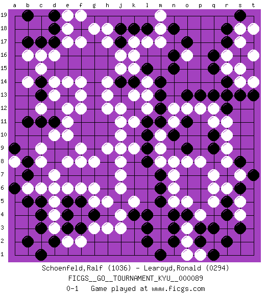 Last move : 0-1 2009 October 17 23:38:19 [Event "FICGS__GO__TOURNAMENT_KYU__000089"] [Site "FICGS"] [Date "2009.08.27"] [Round "1"] [Black "Schoenfeld,Ralf"] [White "Learoyd,Ronald"] [Result "0-1"] [Rating 1 "1036"] [Rating 2 "0294"] 1.q16 d4 2.q3 d16 3.q9 d10 4.f3 j3 5.l4 h5 6.f5 c6 7.c3 d3 8.d2 c2 9.b2 e2 10.c1 f2 11.e3 g3 12.e5 d5 13.g4 h3 14.e4 g5 15.e7 d7 16.f7 j8 17.e9 e10 18.g9 j10 19.f10 e12 20.d8 c8 21.d9 c9 22.h7 j7 23.h6 g6 24.g7 j6 25.j5 k5 26.k4 j4 27.h10 j11 28.h11 h12 29.f11 g11 30.g12 f12 31.g13 h9 32.g10 f8 33.h8 j12 34.f16 d13 35.j9 k9 36.g14 j15 37.h15 j16 38.h16 h17 39.g17 h14 40.f15 g15 41.g16 f14 42.j17 h18 43.j18 k17 44.k18 l17 45.l18 m17 46.o17 m18 47.n18 m19 48.j14 h13 49.k14 k16 50.n15 l14 51.m14 l13 52.l15 k15 53.m13 l12 54.m12 q5 55.r5 r6 56.r4 q6 57.l11 k13 58.n10 r11 59.r13 r9 60.q10 q12 61.q13 p12 62.p13 o12 63.o13 n11 64.m11 m10 65.l10 m9 66.l9 k11 67.l8 m8 68.m7 n8 69.o11 n12 70.o9 r10 71.o7 n7 72.m6 n6 73.o6 n5 74.m5 o5 75.p5 p4 76.p6 o8 77.p7 p8 78.p3 q7 79.n3 m3 80.n4 m4 81.l3 m2 82.l2 o3 83.n2 o2 84.p2 p1 85.q1 o1 86.m1 h9 87.o4 j9 88.c17 c16 89.d17 e17 90.e16 e18 91.b17 g18 92.f18 f17 93.d18 e19 94.d19 f19 95.d15 c15 96.c14 d14 97.e15 e14 98.g15 f13 99.g11 b14 100.c13 c12 101.d11 e11 102.c11 g8 103.b11 f9 104.b5 b6 105.c4 e6 106.b7 e8 107.c5 d6 108.a6 f6 109.a9 a8 110.b8 b16 111.b19 r16 112.r17 o16 113.n16 r15 114.r12 q11 115.s8 s17 116.r18 s18 117.t15 s14 118.s13 t14 119.r14 t16 120.s19 t18 121.q15 r8 122.s6 s7 123.t7 s5 124.r7 s4 125.s3 s7 126.t13 s15 127.r7 r3 128.r2 s7 0-1 Here are the names of the openings (joseki) played in the four corners : Corner d4 : d4 f3 Hoshi (Hwajeom, Seongjeom, Xingwei`) 4-4 Point. The star or hoshi (4-4) point, emphasizing influence at the potential expense of territory. Ikken Kakari (Hankan Keolch'im, Yi Gua`jiao~, 1-Space Low Approach). Black 2 is the standard approach move to the 4-4. Corner q16 : q16 l17 Hoshi (Hwajeom, Seongjeom, Xingwei`) 4-4 Point. The star or hoshi (4-4) point, emphasizing influence at the potential expense of territory. Player White won this Go (weiqi, baduk) game. Follow this game move after move (download)Five liberties for tactical stability. (Anonymous) Are you threatening me, Master Jedi ? (Chancellor Palpatine in Star Wars ep.3)