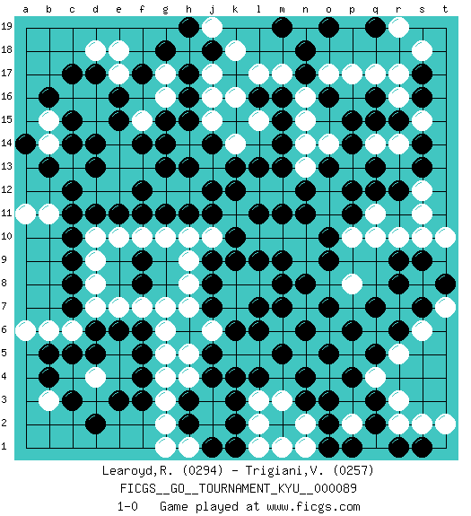 Last move : 1-0 2010 March 23 21:26:35 [Event "FICGS__GO__TOURNAMENT_KYU__000089"] [Site "FICGS"] [Date "2009.08.27"] [Round "1"] [Black "Learoyd,Ronald"] [White "Trigiani,Vincenzo"] [Result "1-0"] [Rating 1 "0294"] [Rating 2 "0257"] 1.q16 d4 2.q3 d16 3.r9 k16 4.f4 e4 5.f5 e5 6.e6 e7 7.f6 f7 8.d6 c6 9.c7 g7 10.c5 g6 11.f3 g5 12.c3 g4 13.e3 d7 14.c8 g3 15.n4 g2 16.c14 b6 17.b5 d8 18.c9 d9 19.c10 d10 20.d11 d12 21.e11 e10 22.f11 f10 23.c12 e12 24.f12 g12 25.g11 g10 26.h11 h10 27.j11 h12 28.k13 g1 29.f17 k11 30.j12 j13 31.h13 b11 32.c11 c13 33.d13 e13 34.d14 e14 35.e15 d15 36.e16 f15 37.f14 g14 38.g13 h14 39.j14 f13 40.f14 j15 41.h15 g16 42.h16 j16 43.h17 j17 44.k10 j10 45.k9 l10 46.l11 l12 47.m11 m12 48.k12 g17 49.g18 h18 50.g15 h14 51.g14 m10 52.n11 o11 53.o10 n10 54.o9 p10 55.m8 n9 56.n8 l8 57.l9 k8 58.j9 h9 59.j8 h8 60.j7 k7 61.k6 j6 62.l7 h7 63.j5 h5 64.j4 j3 65.k3 l3 66.k2 l2 67.k1 l1 68.l4 k5 69.k4 l5 70.m5 m6 71.n6 n7 72.o7 o6 73.l6 n5 74.m7 o4 75.n6 p5 76.o3 m3 77.n3 j2 78.j1 h1 79.h3 h4 80.m9 d3 81.d2 c4 82.b4 b3 83.d5 a6 84.p4 q4 85.o5 q6 86.p6 r5 87.q7 r7 88.r8 s6 89.s7 p2 90.o2 n2 91.h2 n1 92.o1 m1 93.f8 e17 94.f9 l17 95.m16 k18 96.h19 j19 97.j18 l15 98.l16 m17 99.n17 n16 100.m15 n15 101.m14 n14 102.m13 n13 103.n12 o12 104.p11 q10 105.p12 q11 106.o13 r10 107.q12 s11 108.r12 s12 109.s13 o14 110.p14 q14 111.p15 p13 112.q13 r14 113.s14 s15 114.r15 r16 115.q15 q17 116.s16 r17 117.s17 p17 118.o16 o17 119.n18 s18 120.q19 n19 121.o19 r19 122.m19 k14 123.l13 r3 124.q2 r2 125.r1 q1 126.p1 s2 127.s1 t2 128.r6 t7 129.t8 p8 130.q5 d4 131.pass s10 132.s9 t10 133.pass e18 134.d17 d18 135.c17 c16 136.b16 b14 137.b13 a11 138.a14 b15 139.c15 1-0 This go game has been lost on time (started : 2009.08.27 22:18:53) Here are the names of the openings (joseki) played in the four corners : Corner d4 : d4 f4 Hoshi (Hwajeom, Seongjeom, Xingwei`) 4-4 Point. The star or hoshi (4-4) point, emphasizing influence at the potential expense of territory. Ikken Takagakari (Hankan Nop'dakeolch'im, Yi Gaojia, 1-Space High Approach). White typically responds at 6-4 or 3-10. White 4-10 is played when White finds play on the right side advantageous. White 4-8 or 3-8 may be played when White has support at top. Corner d16 : d16 c14 Hoshi (Hwajeom, Seongjeom, Xingwei`) 4-4 Point. The star or hoshi (4-4) point, emphasizing influence at the potential expense of territory. Ikken Kakari (Hankan Keolch'im, Yi Gua`jiao~, 1-Space Low Approach). Black 2 is the standard approach move to the 4-4. Player Black won this Go (weiqi, baduk) game. Follow this game move after move (download)The second line is the line of defeat, the third line is the line of territory, and the fourth line is the line of influence. (Anonymous) First of all, we have to go back to the classical time control. (Anatoly Karpov)