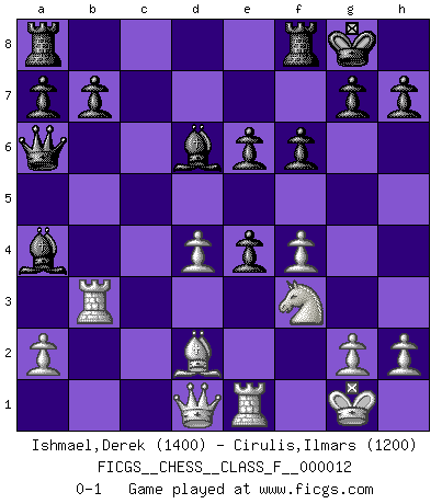Last move : 0-1 2007 May 19 22:10:18 [Event "FICGS__CHESS__CLASS_F__000012"] [Site "FICGS"] [Date "2006.09.23"] [Round "1"] [White "Ishmael,Derek"] [Black "Cirulis,Ilmars"] [Result "0-1"] [WhiteElo "1400"] [BlackElo "1200"] 1.d4 d5 2.Nf3 Nf6 3.Ne5 e6 4.e3 Nc6 5.Nd2 Nxe5 6.dxe5 Nd7 7.Bd3 Nxe5 8.Nf3 Nxd3+ 9.cxd3 c5 10.O-O Bd6 11.d4 c4 12.Ne5 O-O 13.f4 f6 14.Nf3 Bd7 15.Bd2 Qb6 16.Rb1 Bb5 17.b3 cxb3 18.Rxb3 Qa6 19.Re1 Ba4 20.e4 dxe4 0-1 This chess game has been lost on time (started : 2006.09.23 13:23:36) Queen's pawn game Kingside Castling by player White (move 10) Kingside Castling by player Black (move 12) Player Black won this chess game. Follow this game move after move (download)If one piece is badly posted, the whole game is bad. (Tarrasch) Je mehr wir mit Computern analysieren, desto mehr glauben wir an Verteidigung. (Vladimir Kramnik) Un entendimiento minucioso de las típicas continuaciones de mate hacen de las mas complicadas combinaciones de sacrificio que conducen hacia ellas no solo no dificiles, sino casi un asunto de rutina. (Siegbert Tarrasch) Les Echecs sont et restent toujours un combat, un combat intégral comme la boxe, la lutte ou un autre sport, et où il doit y avoir un vainqueur et un vaincu. (Joseph Emil Diemer) Question: Is 'This statement is paradoxical' a paradoxical statement ? Or is it a meta-paradox ? (Normajean Yates)