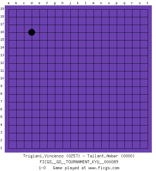 Last move : 1-0 2009 September 28 10:4:40 [Event "FICGS__GO__TOURNAMENT_KYU__000089"] [Site "FICGS"] [Date "2009.08.27"] [Round "1"] [Black "Trigiani,Vincenzo"] [White "Tallant,Amber"] [Result "1-0"] [Rating 1 "0257"] [Rating 2 "0000"] 1.d16 1-0 This go game has been lost on time (started : 2009.08.27 22:18:53) Here are the names of the openings (joseki) played in the four corners : Player Black won this Go (weiqi, baduk) game. Follow this game move after move (download)Ikken tobi is never wrong. (Anonymous) Computers make it easier to do a lot of things, but most of the things they make it easier to do don't need to be done. (Andy Rooney)