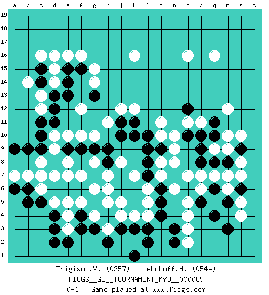 Last move : 0-1 2010 March 19 9:17:42 [Event "FICGS__GO__TOURNAMENT_KYU__000089"] [Site "FICGS"] [Date "2009.08.27"] [Round "1"] [Black "Trigiani,Vincenzo"] [White "Lehnhoff,Heinz-Georg"] [Result "0-1"] [Rating 1 "0257"] [Rating 2 "0544"] 1.d4 q16 2.q4 d16 3.k10 k4 4.k1 c6 5.k5 r6 6.k3 l4 7.m4 j4 8.h4 j5 9.j3 l5 10.m5 h5 11.l3 q9 12.g5 r12 13.k6 l6 14.m6 g6 15.l7 h6 16.f6 g4 17.f4 f5 18.d6 f7 19.g7 h3 20.h2 d7 21.e6 e7 22.c5 e4 23.f3 e3 24.d3 d5 25.d2 p6 26.e2 e5 27.g3 f16 28.b5 o16 29.b6 k16 30.j6 h7 31.j7 m7 32.n7 m8 33.l8 n8 34.l9 n6 35.o6 o7 36.c7 g8 37.h8 j8 38.h9 f10 39.j10 h11 40.d8 d10 41.p5 k12 42.j11 j12 43.g9 k7 44.f9 c13 45.e9 c8 46.c9 b7 47.b9 g10 48.k11 s4 49.q6 o5 50.r5 o4 51.l2 e10 52.c10 d9 53.a6 q7 54.s6 r7 55.p8 s5 56.r3 m11 57.d11 a7 58.a9 c7 59.d12 f12 60.d13 d14 61.e13 c12 62.e14 d15 63.c14 b14 64.c11 g14 65.e15 e16 66.c15 c16 67.f15 g15 68.g13 s7 69.r8 r9 70.p9 o2 71.n3 o3 72.n2 p7 73.q10 r10 74.q8 s8 75.s9 s10 76.q11 o11 77.p10 e8 78.l10 m10 79.m9 n9 80.o10 n10 81.o12 p11 0-1 This go game has been lost on time (started : 2009.08.27 22:18:53) Here are the names of the openings (joseki) played in the four corners : Corner d4 : d4 c6 Hoshi (Hwajeom, Seongjeom, Xingwei`) 4-4 Point. The star or hoshi (4-4) point, emphasizing influence at the potential expense of territory. Ikken Kakari (Hankan Keolch'im, Yi Gua`jiao~, 1-Space Low Approach). White 2 is the standard approach move to the 4-4. Corner q4 : q4 r6 Hoshi (Hwajeom, Seongjeom, Xingwei`) 4-4 Point. The star or hoshi (4-4) point, emphasizing influence at the potential expense of territory. Ikken Kakari (Hankan Keolch'im, Yi Gua`jiao~, 1-Space Low Approach). White 2 is the standard approach move to the 4-4. Player White won this Go (weiqi, baduk) game. Follow this game move after move (download)The rectangular six is normally alive. (Anonymous) You can't play chess if you're groggy from pills. (Anatoly Karpov)