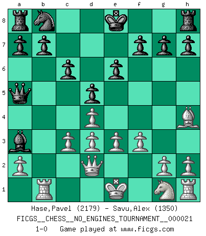 Last move : 1-0 2009 December 3 20:53:45 [Event "FICGS__CHESS__NO_ENGINES_TOURNAMENT__000021"] [Site "FICGS"] [Date "2009.08.28"] [Round "1"] [White "Hase,Pavel"] [Black "Savu,Alex"] [Result "1-0"] [WhiteElo "2179"] [BlackElo "1350"] 1.d4 d5 2.Nc3 Nf6 3.Bg5 Ne4 4.Bh4 c6 5.f3 Nxc3 6.bxc3 Qa5 7.Qd2 Bf5 8.e3 e6 9.Bd3 Ba3 10.Rb1 Bxd3 11.cxd3 1-0 Richter-Veresov attack Player White won this chess game. Follow this game move after move (download)When I have White, I win because I am white; When I have Black, I win because I am Bogolyubov. (Bogolyubov) Schach sollte überall auf der Welt Schulfach werden. Es fördert die geistige Auseinandersetzung. Es lehrt die Demut in der Niederlage. (Garry Kasparov) Es el objetivo de la escuela moderna no tratar cada posición de acuerdo a una regla general, sino de acuerdo al principio inherente en la posición. (Richard Reti) Un journaliste : 'Vous préférez avoir une dame de plus sur l'échiquier ou au lit ?' Boris Spassky : 'Ca dépend de la position.' Pushing plastic is for the many, pushing virtual pieces is for the fewer, pushing wood is for the very few. (Normajean Yates)