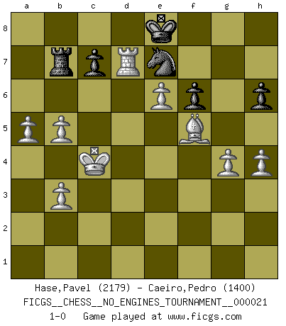 Last move : 1-0 2009 October 18 2:14:21 [Event "FICGS__CHESS__NO_ENGINES_TOURNAMENT__000021"] [Site "FICGS"] [Date "2009.08.28"] [Round "1"] [White "Hase,Pavel"] [Black "Caeiro,Pedro"] [Result "1-0"] [WhiteElo "2179"] [BlackElo "1400"] 1.d4 Nf6 2.Nc3 d5 3.Bg5 e6 4.e4 dxe4 5.Nxe4 Be7 6.Bxf6 Bxf6 7.Nf3 O-O 8.Bc4 Nd7 9.Qe2 Nb6 10.Nxf6+ Qxf6 11.Bb3 Bd7 12.O-O-O Nd5 13.Ne5 Rfd8 14.g3 a6 15.f4 Bc6 16.Nxc6 bxc6 17.Qe5 Rab8 18.Qxf6 Nxf6 19.Rhe1 g6 20.Re5 Nd5 21.c4 Ne7 22.Ra5 Rb6 23.Kc2 Nf5 24.Kc3 Ra8 25.g4 Ne7 26.Bc2 Kg7 27.Re1 Nc8 28.a4 R6b8 29.h4 Nd6 30.Rc5 a5 31.Rxc6 Ra7 32.Re5 Nc8 33.R6c5 Rab7 34.b3 Ne7 35.d5 Nc8 36.dxe6 f6 37.Red5 Ne7 38.Rd7 Kf8 39.Rxa5 Ke8 40.Rb5 Rxb5 41.cxb5 Rb6 42.f5 gxf5 43.Bxf5 h6 44.Kc4 Rb7 45.a5 1-0 Queen's pawn game Kingside Castling by player Black (move 7) Queenside Castling by player White (move 12) Player White won this chess game. Follow this game move after move (download)Bobby is the most misunderstood, misquoted celebrity walking the face of this earth. (Yasser Seirawan) Das Schachspiel ist ein See, in welchem eine Mücke baden und ein Elefant ertrinken kann. (Emanuel Lasker) Hasta este punto, las blancas han seguido un análisis bien conocido. Pero ahora el hace un error fatal: empieza a usar su propia cabeza. (Siegbert Tarrasch) Le pion, dans sa simplicité, marche droit devant lui, mais lorsqu'il prend, il le fait obliquement? Ainsi l'homme, tant qu'il reste pauvre, marche dans la droiture et vit honnêtement, mais lorsqu'il recherche les honneurs, il flatte, se parjure et, par les voies obliques, cherche une position supérieure sur l'échiquier du monde. (Jean de Galles) He is a liar. I just don't know what the lie is yet. (Horatio Caine, C.S.I. Miami)