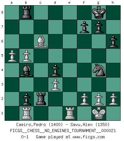 Last move : 0-1 2009 September 8 14:44:45 [Event "FICGS__CHESS__NO_ENGINES_TOURNAMENT__000021"] [Site "FICGS"] [Date "2009.08.28"] [Round "1"] [White "Caeiro,Pedro"] [Black "Savu,Alex"] [Result "0-1"] [WhiteElo "1400"] [BlackElo "1350"] 1.e4 d5 2.exd5 Nf6 3.c4 c6 4.dxc6 Nxc6 5.Nf3 e5 6.d3 Bg4 7.Be2 Be7 8.O-O O-O 9.a3 a5 10.Nc3 Qd7 11.Be3 h6 12.Qc2 Bxf3 13.Bxf3 Nd4 14.Bxd4 exd4 15.Nb5 Rfc8 16.b4 Qxb5 17.cxb5 Rxc2 18.Bxb7 Rb8 19.Bc6 axb4 20.a4 b3 21.a5 b2 22.Rab1 Ng4 23.Rfe1 Bb4 0-1 Scandinavian gambit Kingside Castling by player White (move 8) Kingside Castling by player Black (move 8) Player Black won this chess game. Follow this game move after move (download)Is Bobby Fischer quite sane ? (Salo Flohr) Die Arbeit ist etwas Unnatürliches. Die Faulheit allein ist göttlich. (Anatole France) No hay precio que no valga la pena por la cabellera del Rey enemigo. (Koblentz) Même si l'adversaire joue le coup analysé précédemment, recommencez l'analyse en voyant la nouvelle position. Première règle de Blumenfeld If you are going through hell, keep going. (Winston Churchill)