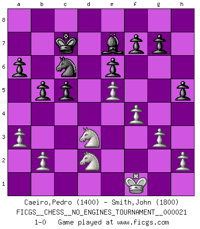 Last move : 1-0 2010 January 20 20:23:48 [Event "FICGS__CHESS__NO_ENGINES_TOURNAMENT__000021"] [Site "FICGS"] [Date "2009.08.28"] [Round "1"] [White "Caeiro,Pedro"] [Black "Smith,John"] [Result "1-0"] [WhiteElo "1400"] [BlackElo "1800"] 1.e4 c6 2.d4 d5 3.e5 Bf5 4.Bd3 Bxd3 5.Qxd3 e6 6.Ne2 c5 7.c4 Nc6 8.cxd5 Qxd5 9.Nf4 Qxd4 10.Qxd4 Nxd4 11.Na3 O-O-O 12.Be3 Nh6 13.Rc1 Kb8 14.Rc4 Nhf5 15.Bxd4 Rxd4 16.Rxd4 Nxd4 17.O-O Be7 18.Rd1 Rd8 19.Kf1 Nc6 20.Rxd8+ Bxd8 21.Nd3 Be7 22.f4 h5 23.g3 a6 24.Nc4 Kc7 25.a3 b5 26.Nd2 1-0 Caro-Kann : Advance variation Queenside Castling by player Black (move 11) Kingside Castling by player White (move 17) Player White won this chess game. Follow this game move after move (download)There just isn't enough televised Chess. (David Letterman) Drei Punkte vor allen anderen ist wie einer, der im weißen Anzug posiert, während der Rest in Müllsäcke gekleidet dasteht. (Viktor Kortschnoi) Todo lo que importa ante el tablero de Ajedrez son buenas jugadas. (Bobby Fischer) C'est une question de caractère, Beaucoup de gens perdent leur motivation très vite. D'autres, ils sont rares, peuvent la conserver très longtemps. J'aime les échecs, encore aujourd'hui je suis heureux d'analyser des parties. J'aime toujours gagner, je déteste encore perdre. Bien jouer est important pour mon intégrité intellectuelle et morale. Et puis les échecs vivent en ce moment une période historique grâce à Internet. Ils se développent dans les systèmes éducatifs à travers le monde. Ils sortent de leur ghetto, et c'est mon rôle de mener à bien cette révolution. (Gary Kasparov) Bobby never cared about money, though. His only desire was to prove that his choices were correct: He wanted chess to be important because he was a chess player, and he wanted to be important. Bobby knew money was important, but he didn't have a clue why, outside of clothes and status. The only way he could accomplish what he wanted was to fight for a lot of money. Once he got it, he gave it away. He did not know how to spend it. And once he'd become champion, after, essentially, sacrificing his life for it, he didn't know how to spend his time. (Bob Wade)