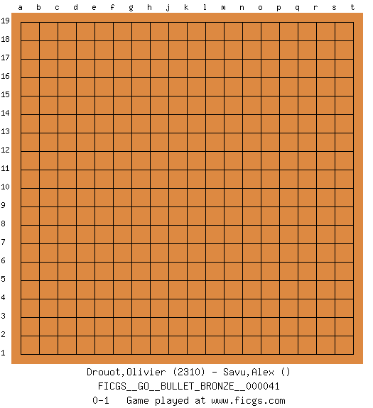 Last move : 0-1 2009 August 29 2:35:23 [Event "FICGS__GO__BULLET_BRONZE__000041"] [Site "FICGS"] [Date "2009.08.29"] [Round "1"] [Black "Drouot,Olivier"] [White "Savu,Alex"] [Result "0-1"] [Rating 1 "2310"] 0-1 This go game has been lost on time (started : 2009.08.29 2:5:15) Comment by player 2 : Alex Savu : A little confusing, I guess the other player wasn't online...or maybe a problem with my browser? Anyway, a strange first go game. Here are the names of the openings (joseki) played in the four corners : Player White won this Go (weiqi, baduk) game. Follow this game move after move (download)Don't count territory held by only one eye. (Anonymous) Ah, beer! The cause of, and the solution to, all of life's problems. (Homer Simpson)