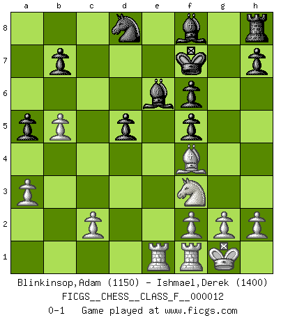 Last move : 0-1 2007 February 13 4:12:10 [Event "FICGS__CHESS__CLASS_F__000012"] [Site "FICGS"] [Date "2006.09.23"] [Round "1"] [White "Blinkinsop,Adam"] [Black "Ishmael,Derek"] [Result "0-1"] [WhiteElo "1150"] [BlackElo "1400"] 1.e4 e6 2.d4 d5 3.e5 c5 4.Nf3 Nc6 5.Nc3 cxd4 6.Nb5 f6 7.Bd3 Nge7 8.O-O Nf5 9.Bf4 Bd7 10.exf6 gxf6 11.Nc7+ Kf7 12.Nxa8 Qxa8 13.Bxf5 exf5 14.Qe2 Nb4 15.Nxd4 Qe8 16.Qxe8+ Bxe8 17.Rae1 Bd7 18.a3 Nc6 19.Nf3 Be6 20.b4 a5 21.b5 Nd8 0-1 French : Advance, Nimzovich system Kingside Castling by player White (move 8) Player Black won this chess game. Follow this game move after move (download)Life is a kind of Chess, with struggle, competition, good and ill events. (Benjamin Franklin) Man gibt nur Pakete auf. (Paul Keres) Aquellos que dicen entender al Ajedrez, no entienden nada. (Robert Hubner) Le génie consiste à savoir transgresser les règles au moment opportun. (Teichmann) It's not enough to succeed. Others must fail. (Gore Vidal)