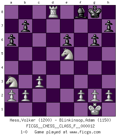 Last move : 1-0 2006 October 4 2:3:54 [Event "FICGS__CHESS__CLASS_F__000012"] [Site "FICGS"] [Date "2006.09.23"] [Round "1"] [White "Hess,Volker"] [Black "Blinkinsop,Adam"] [Result "1-0"] [WhiteElo "1200"] [BlackElo "1150"] 1.e4 c5 2.c3 d6 3.d4 Nf6 4.Bd3 Nbd7 5.Nf3 g6 6.O-O Bg7 7.Be3 Nb6 8.dxc5 dxc5 9.e5 Nfd5 10.Bb5+ Nd7 11.Qxd5 O-O 12.Rd1 Qa5 13.Bxd7 e6 14.Qxc5 Qxc5 15.Bxc5 Rd8 16.Be7 Bxd7 17.Bxd8 Rxd8 18.Na3 a6 19.Rd4 f6 20.Rad1 fxe5 21.Rxd7 Rb8 22.Rd8+ Rxd8 23.Rxd8+ Bf8 24.Nxe5 1-0 Sicilian : Alapin's variation (2.c3) Kingside Castling by player White (move 6) Kingside Castling by player Black (move 11) Player White won this chess game. Follow this game move after move (download)The boy (then a 12 year old boy named Anatoly Karpov) doesn't have a clue about Chess, and there's no future at all for him in this profession. (Mikhail Botvinnik) Wenn ein Kopf und ein Buch zusammenstoßen und es klingt hohl, ist es denn allemal im Buche? (Georg Christoph Lichtenberg) Coloca el contenido del tablero de Ajedrez en un sombrero, agita las piezas vigorosamente, derrámalas en el tablero desde una altura de medio metro y así obtienes el estilo de Wilhelm Steinitz. (H. E. Bird) Les Cavaliers se révèlent fort utiles dans les positions fermées. D'habitude, les Fous sont un peu plus forts que les Cavaliers dans les positions ouvertes. Qu'on le veuille ou non, il restera toujours des exceptions ! There is a great deal of difference between an eager man who wants to read a book and a tired man who wants a book to read. (G.K. Chesterton)
