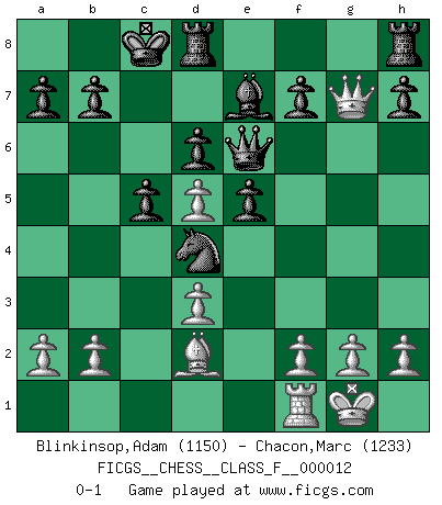 Last move : 0-1 2006 October 3 17:21:12 [Event "FICGS__CHESS__CLASS_F__000012"] [Site "FICGS"] [Date "2006.09.23"] [Round "1"] [White "Blinkinsop,Adam"] [Black "Chacon,Marc"] [Result "0-1"] [WhiteElo "1150"] [BlackElo "1233"] 1.e4 c5 2.Bc4 e5 3.Nf3 Nc6 4.Ng5 Qxg5 5.d3 Qe7 6.O-O Nf6 7.Qf3 Nd4 8.Qh3 d6 9.Qg3 Nxc2 10.Bb5+ Bd7 11.Qg5 Bxb5 12.Na3 Nxa1 13.Nxb5 Nc2 14.Bd2 Nd4 15.Nc3 Qe6 16.Nd5 Nxd5 17.exd5 Be7 18.Qxg7 O-O-O 0-1 Sicilian defense Kingside Castling by player White (move 6) Queenside Castling by player Black (move 18) Player Black won this chess game. Follow this game move after move (download)When you absolutely don't know what to do anymore, it is time to panic. (John van der Wiel) Du musst Deinen Gegner in einen tiefen dunklen Wald führen wo 2+2=5 ist und wo der Weg, der wieder hinausführt, nur breit genug für einen ist. (Mikhail Nekhemyevich Tal) Cuando estes solo, cuando te sientas un extraño en el mundo, juega al Ajedrez. Esto levantará tu espiritu y será tu consejero de guerra. (Aristóteles) Il (Jacob Murray) ne joue pas pour le bon coup, mais pour le meilleur. (Eloi Relange) We need strong personalities and only one world champion to attract sponsors. (Anatoly Karpov)