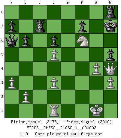 Last move : 1-0 2006 September 12 17:31:25 [Event "FICGS__CHESS__CLASS_A__000003"] [Site "FICGS"] [Date "2006.04.22"] [Round "1"] [White "Pintor,Manuel"] [Black "Pires,Miguel"] [Result "1-0"] [WhiteElo "2173"] [BlackElo "2000"] 1.e4 c5 2.Nc3 d6 3.f4 Nf6 4.d4 cxd4 5.Qxd4 Nc6 6.Qd2 g6 7.Nf3 Bg7 8.Bd3 O-O 9.O-O Bd7 10.h3 Nb4 11.Qf2 Qa5 12.Be3 Rfc8 13.a3 Nxd3 14.cxd3 Bc6 15.Bd4 Qa6 16.Rad1 b6 17.Qh4 Rc7 18.f5 Re8 19.Bxf6 Bxf6 20.Ng5 h5 21.Nd5 Bxd5 22.exd5 Kg7 23.fxg6 Kxg6 24.g4 Rh8 25.Rxf6 exf6 26.Ne4 Kh7 27.Nxf6+ 1-0 Sicilian : Closed Kingside Castling by player Black (move 8) Kingside Castling by player White (move 9) Player White won this chess game. Follow this game move after move (download)The game of chess is the touchstone of the intellect. (Goethe) Ich erzeugte keinen Neid, da mich die Schachspieler als Musiker und die Musiker als Schachspieler betrachteten. (Mark Taimanov) Nunca antes ha habido un jugador de Ajedrez con tal conocimiento a fondo de las complejidades del juego y una inmensa voluntad absolutamente indomable de ganar. Yo pienso que Fischer es el jugador mas grande que jamás haya existido. (Lisa Lane) Tous ces prétendus hommes politiques sont les pions, les Cavaliers, les Tours ou les Fous d'une partie d'échecs qui se jouera tant qu'un hasard ne renversera pas l'échiquier. (Honoré de Balzac) To be champion requires more than simply being a strong player; one has to be a strong human being as well. (Anatoly Karpov)