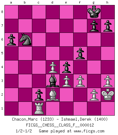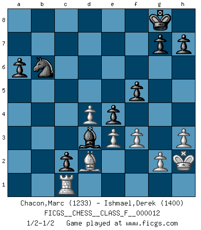Last move : 1/2-1/2 2007 January 8 17:43:37 [Event "FICGS__CHESS__CLASS_F__000012"] [Site "FICGS"] [Date "2006.09.23"] [Round "1"] [White "Chacon,Marc"] [Black "Ishmael,Derek"] [Result "1/2-1/2"] [WhiteElo "1233"] [BlackElo "1400"] 1.d4 Nf6 2.c4 d5 3.e3 Bg4 4.Nf3 e6 5.Be2 Bd6 6.Nc3 O-O 7.O-O Ne4 8.Nxe4 dxe4 9.Nd2 Bf5 10.Qb3 b6 11.d5 exd5 12.cxd5 c6 13.dxc6 Nxc6 14.Qb5 Ne7 15.Nb3 a6 16.Qc4 Qc8 17.Qd4 Rd8 18.Qc3 Qxc3 19.bxc3 Be5 20.Nd4 Bxd4 21.cxd4 Nd5 22.Bc4 b5 23.Bd2 bxc4 24.Rfc1 Rdc8 25.a4 c3 26.Be1 Rab8 27.h3 Bd7 28.Kh2 Rb2 29.Rab1 Bxa4 30.Rxb2 f5 31.Ra2 Bb5 32.Ra3 c2 33.Bd2 Bd3 34.f3 Nb6 35.Rc3 Rxc3 36.Bxc3 Na4 37.Bd2 Nb6 1/2-1/2 Queen's pawn game Kingside Castling by player Black (move 6) Kingside Castling by player White (move 7) This chess game ended in a draw. Follow this game move after move (download)No Chess Grandmaster is normal; they only differ in the extent of their madness. (Viktor Korchnoi) Bis zum Jahr 1971 verlief in meiner Schachkariere alles glatt. Dieses dramatische Match [Fischer-Taimanov 6:0] machte mein Leben zur Hölle. (Mark Taimanov) No hay otro maestro que tenga una voluntad terrífica de ganar. Al tablero, el irradía peligro y aún los oponentes mas fuertes tienden a congelarse como liebres cuando olfatean a una pantera. Aún sus debilidades son peligrosas. Con las blancas, su juego de apertura es predecible - te es posible hacer planes en su contra - pero es tan fuerte que tus planes casi nunca funcionan. En el juego medio, su precisión e invención son fabulosas y en finales, tú simplemente no le puedes vencer. (Experto Alemán anónimo) On croit qu'il y a plus de mauvais joueurs que de bons joueurs, c'est faux : Il y a autant de joueurs qui gagnent que de joueurs qui perdent. (Philippe Geluck) Pretend inferiority and encourage his arrogance. (Sun Tzu)