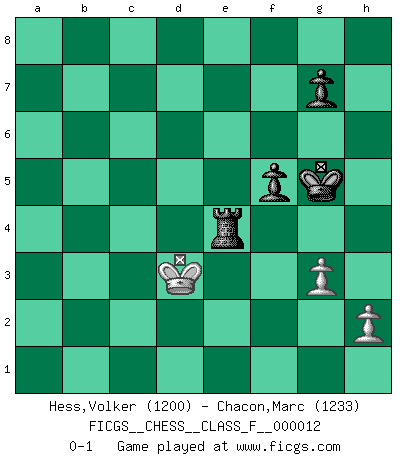 Last move : 0-1 2006 October 1 15:9:57 [Event "FICGS__CHESS__CLASS_F__000012"] [Site "FICGS"] [Date "2006.09.23"] [Round "1"] [White "Hess,Volker"] [Black "Chacon,Marc"] [Result "0-1"] [WhiteElo "1200"] [BlackElo "1233"] 1.e4 c5 2.c3 Nc6 3.d4 cxd4 4.cxd4 e6 5.Nf3 d6 6.Nc3 Nf6 7.Bb5 Bd7 8.O-O Be7 9.Bg5 O-O 10.Bd3 Qb6 11.Na4 Qa5 12.Bxf6 Bxf6 13.e5 dxe5 14.dxe5 Nxe5 15.Nxe5 Bxa4 16.b3 Bxe5 17.bxa4 Bxa1 18.Qxa1 Qxa4 19.Qb1 Rad8 20.Bxh7+ Kh8 21.Bc2 Qa6 22.Qb3 e5 23.Qh3+ Qh6 24.Qf5 Rc8 25.Be4 Rc1 26.g3 Rxf1+ 27.Kxf1 Kg8 28.Qxe5 Qe6 29.Qxe6 fxe6 30.Bxb7 Rb8 31.Be4 Rb4 32.Bc2 a5 33.Ke2 Rb2 34.Kd3 Rxa2 35.f4 Kf7 36.Kc3 Ra1 37.Bb3 a4 38.Bc4 a3 39.f5 Rc1+ 40.Kb3 Rxc4 41.Kxa3 exf5 42.Kb3 Re4 43.Kc3 Kg6 44.Kd3 Kg5 0-1 Sicilian : Alapin's variation (2.c3) Kingside Castling by player White (move 8) Kingside Castling by player Black (move 9) 10 pieces endgame at move 34 : White KBPPP , Black KRPPP WHITE : King + 1 Bishop 3 Pawns BLACK : King + 1 Rook 3 Pawns 9 pieces endgame at move 40 : White KPPP , Black KRPPP WHITE : King + 3 Pawns BLACK : King + 1 Rook 3 Pawns 8 pieces endgame at move 41 : White KPPP , Black KRPP WHITE : King + 3 Pawns BLACK : King + 1 Rook 2 Pawns 7 pieces endgame at move 41 : White KPP , Black KRPP WHITE : King + 2 Pawns BLACK : King + 1 Rook 2 Pawns Player Black won this chess game. Follow this game move after move (download)Chess is everything: art, science and sport. (Anatoly Karpov) Korrekt heißt in Deutschland die Haltung eines Mannes, dessen Benehmen nach dem Urteile seiner Nachbarn seiner Stellung angemessen ist. Um korrekt zu sein, muß man sich der Meinung der anderen anpassen... (Emanuel Lasker) Los asuntos humanos son como una partida de Ajedrez: solo aquellos que no lo toman seriamente, pueden ser llamados buenos jugadores. (Hung Tzu Ch'eng) J'ai vu le vaincu d'Echecs jouer des années durant dans l'espoir de la fête de la victoire. Car tu es plus riche de ce qu'elle existe si même elle n'est point pour toi. Ainsi de la perle du fond des mers. (Antoine de Saint-Exupéry) Mandala - that's it! 16x16 squares as multiple of the four and the eight because of the Four Noble Truths and the Noble Eightfold Path. (Heinz-Georg Lehnhoff about Big Chess)
