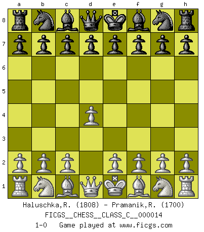 Last move : 1-0 2006 November 13 22:52:19 [Event "FICGS__CHESS__CLASS_C__000014"] [Site "FICGS"] [Date "2006.09.23"] [Round "1"] [White "Haluschka,Rainer"] [Black "Pramanik,Ranadeep"] [Result "1-0"] [WhiteElo "1808"] [BlackElo "1700"] 1.d4 1-0 This chess game has been lost on time (started : 2006.09.23 15:11:39) Queen's pawn Player White won this chess game. Follow this game move after move (download)Good positions don't win games, good moves do. (Gerald Abrahams) Die meiste Zeit treffe ich auf Gegner, die meine Enkel sein könnten. Ich bin da, um ihnen zu zeigen, dass sie von mir noch einiges lernen können. (Viktor Kortschnoi) Vive, pierde y aprende al observar a tu oponente como ganar. (Amber Steenbock) Le joueur d'Echecs qui veut atteindre le top est obligé de développer son propre credo créatif. Alexeï Stepanovicth Souétine. Il est facile d'écrire des livres ! Ce qui est difficile, c'est de jouer ! (Alexeï Stepanovicth Souétine) Follow your passion, and success will follow you. (Arthur Buddhold)