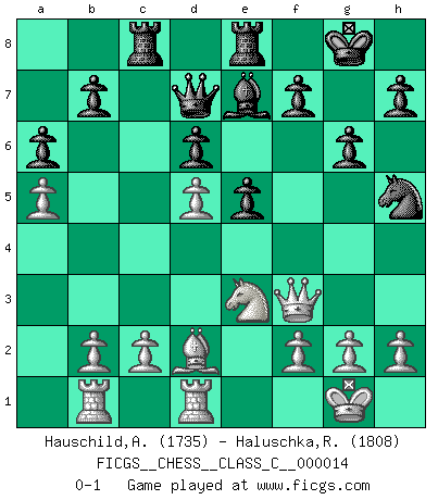 Last move : 0-1 2007 January 9 17:19:23 [Event "FICGS__CHESS__CLASS_C__000014"] [Site "FICGS"] [Date "2006.09.23"] [Round "1"] [White "Hauschild,Achim"] [Black "Haluschka,Rainer"] [Result "0-1"] [WhiteElo "1735"] [BlackElo "1808"] 1.e4 c5 2.Nf3 d6 3.d4 Nf6 4.Nc3 cxd4 5.Nxd4 e5 6.Bb5+ Nbd7 7.Nf5 a6 8.Bxd7+ Qxd7 9.Ne3 Qc6 10.Qf3 Be6 11.O-O Qd7 12.Rd1 Rc8 13.Ncd5 Bxd5 14.exd5 Be7 15.a4 O-O 16.a5 Rfe8 17.Bd2 g6 18.Rab1 Nh5 0-1 This chess game has been lost on time (started : 2006.09.23 15:11:39) Sicilian Kingside Castling by player White (move 11) Kingside Castling by player Black (move 15) Player Black won this chess game. Follow this game move after move (download)Combinations have always been the most intriguing aspect of Chess. The masters look for them, the public applauds them, the critics praise them. It is because combinations are possible that Chess is more than a lifeless mathematical exercise. They are the poetry of the game; they are to Chess what melody is to music. They represent the triumph of mind over matter. (Reuben Fine) Dein Körper muss in Topform sein. Dein Schach verfällt, wenn dein Körper verfällt. Der Körper kann nicht vom Geist getrennt werden. (Robert James Fischer) Un juego de Ajedrez es un dialogo, una conversación entre un jugador y su oponente. Cada movimiento del oponente puede contener amenazas o tropiezos, pero un jugador no se puede defender de las amenazas o tomar ventaja de los tropiezos si es que no se pregunta a sí mismo: ¿Que es lo que mi oponente va a hacer después de cada movida?. (Bruce A. Moon) Soyez une menace à chaque fois que vous vous asseyez pour jouer. (Ken Smith) Memory is a way of holding onto the things you love, the things you are, the things you never want to lose. (from the television show: The Wonder Years)