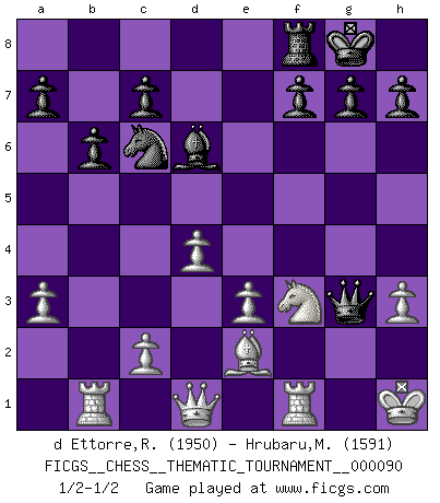 Last move : 1/2-1/2 2009 October 14 11:0:7 [Event "FICGS__CHESS__THEMATIC_TOURNAMENT__000090"] [Site "FICGS"] [Date "2009.08.29"] [Round "1"] [White "d Ettorre,Rodolfo"] [Black "Hrubaru,Mircea"] [Result "1/2-1/2"] [WhiteElo "1950"] [BlackElo "1591"] 1.e4 e5 2.Nf3 Nc6 3.Nc3 Nf6 4.a3 d5 5.exd5 Nxd5 6.Bb5 Nxc3 7.bxc3 Bd6 8.d4 exd4 9.cxd4 O-O 10.O-O Bg4 11.Be3 Qf6 12.Be2 Rae8 13.Rb1 b6 14.h3 Bxh3 15.gxh3 Rxe3 16.fxe3 Qg6+ 17.Kh1 Qg3 1/2-1/2 Four knights : Gunsberg variation Kingside Castling by player Black (move 9) Kingside Castling by player White (move 10) This chess game ended in a draw. Follow this game move after move (download)Adequate compensation for a sacrifice is having a sound combination leading to a winning position; adequate compensation for a blunder is having your opponent snatch defeat from the jaws of victory. (Bruce A. Moon) Ich kenne keine einzige Person, die behaupten würde, Garri Kasparow sei ein guter Mensch (Nigel Short) Después de la respuesta de las negras a 1.e4 con 1..e5, se quedan siempre tratando de entrar dentro del juego. (Howard Staunton) Le jeu d'échecs est comme rejeté hors du temps. (Antoine de Saint-Exupéry) All men can see these tactics whereby I conquer, but what none can see is the strategy out of which victory is evolved. (Sun Tzu)