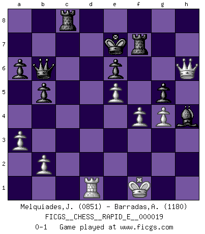 Last move : 0-1 2009 September 6 20:49:30 [Event "FICGS__CHESS__RAPID_E__000019"] [Site "FICGS"] [Date "2009.08.29"] [Round "1"] [White "Melquiades,Jay"] [Black "Barradas,Anderson"] [Result "0-1"] [WhiteElo "0851"] [BlackElo "1180"] 1.e4 c5 2.Nf3 e6 3.Be2 d5 4.Nc3 dxe4 5.Nxe4 Nc6 6.Bb5 Bd7 7.a3 a6 8.Bc4 b5 9.Ba2 c4 10.Nfg5 Ne5 11.d4 cxd3 12.cxd3 h6 13.h4 hxg5 14.d4 Ng6 15.Nxg5 Be7 16.Qf3 f6 17.g3 fxg5 18.h5 Ne5 19.dxe5 Nh6 20.Bb1 Rf8 21.Qd3 Nf5 22.f4 Qb6 23.g4 Nd4 24.Qg6+ Kd8 25.h6 gxh6 26.Qe4 Bc6 27.Qg6 Bxh1 28.Be4 Bxe4 29.Qxe4 Rc8 30.Be3 Bc5 31.Rd1 Ke7 32.Bxd4 Bxd4 33.Qh7+ Rf7 34.Qxh6 Bf2+ 35.Kf1 Bh4 0-1 Sicilian defense Player Black won this chess game. Follow this game move after move (download)Up to this point White has been following well-known analysis. But now he makes a fatal error: he begins to use his own head. (Siegbert Tarrasch) Bis jetzt ist Weiß einer wohlbekannten Analyse gefolgt. Aber jetzt begeht er einen schrecklichen Fehler: Er beginnt seinen eigenen Kopf zu benutzen. (Siegbert Tarrasch) Después de la respuesta de las negras a 1.e4 con 1..e5, se quedan siempre tratando de entrar dentro del juego. (Howard Staunton) Votre prénom est 'Tactique', votre deuxième prénom est 'Tactique' et votre nom est 'Tactique'. (Ken Smith) I teach you to lie, cheat and steal, and as soon as my back's turned you wait in line ? (Gregory House, House M.D.)