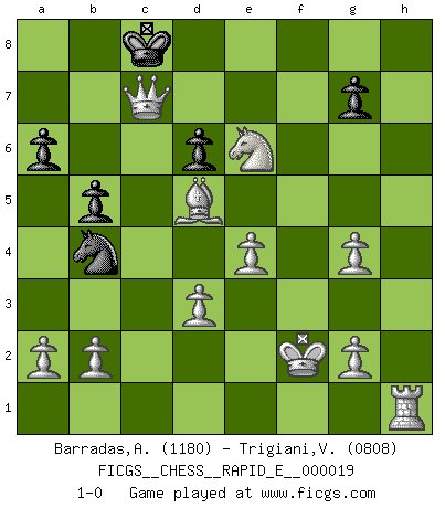 Last move : 1-0 2009 September 19 18:8:22 [Event "FICGS__CHESS__RAPID_E__000019"] [Site "FICGS"] [Date "2009.08.29"] [Round "1"] [White "Barradas,Anderson"] [Black "Trigiani,Vincenzo"] [Result "1-0"] [WhiteElo "1180"] [BlackElo "0808"] 1.e4 e5 2.Nf3 Bc5 3.Bc4 Nf6 4.d3 Ng4 5.O-O Nxf2 6.Rxf2 Bxf2+ 7.Kxf2 O-O 8.Nxe5 d6 9.Nf3 Bg4 10.h3 Nc6 11.hxg4 Qf6 12.Bg5 Qg6 13.Nc3 Rae8 14.Nd5 a6 15.Nxc7 Rc8 16.Nd5 Rce8 17.Nf4 b5 18.Bd5 Nb4 19.Nxg6 h6 20.Nxf8 hxg5 21.Nd7 Rd8 22.Nxg5 Rxd7 23.Qh1 Nxc2 24.Qh7+ Kf8 25.Rh1 Rc7 26.Qh8+ Ke7 27.Qg8 Nb4 28.Qxf7+ Kd8 29.Ne6+ Kc8 30.Qxc7+ 1-0 King's knight Opening Kingside Castling by player White (move 5) Kingside Castling by player Black (move 7) Player White won this chess game. Follow this game move after move (download)We like to think. (Gary Kasparov) Später, ... hatte ich zunehmend Erfolg in entscheidenden Partien. Vielleicht weil ich eine einfache Wahrheit erkannte: nicht nur ich hatte Angst, auch mein Gegner. (Mikhail Nekhemyevich Tal) El Ajedrez es tortura mental. (Garry Kasparov) Mais l'homme est une créature légère et illogique : semblable au joueur d'échecs, il n'aime que le processus du but à atteindre, non le but lui-même. (Dostoïevsky) The various flowers seem good to different people. (Chinese proverb)