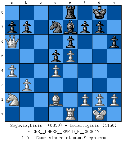 Last move : 1-0 2009 September 29 20:51:53 [Event "FICGS__CHESS__RAPID_E__000019"] [Site "FICGS"] [Date "2009.08.29"] [Round "1"] [White "Segovia,Didier"] [Black "Belaz,Egidio"] [Result "1-0"] [WhiteElo "0890"] [BlackElo "1150"] 1.e4 c5 2.c3 d6 3.d4 cxd4 4.Bb5+ Bd7 5.Bxd7+ Nxd7 6.cxd4 Ngf6 7.Nc3 e6 8.Bg5 Be7 9.Nf3 O-O 10.O-O Qb6 11.b3 Rfe8 12.a4 Rac8 13.Rc1 Qb4 14.Re1 h6 15.Bd2 Qb6 16.Na2 Rxc1 17.Bxc1 Qc6 18.Qd3 d5 19.e5 Ne4 20.Nd2 Nxd2 21.Bxd2 Qa6 22.Qxa6 1-0 Sicilian : Alapin's variation (2.c3) Kingside Castling by player Black (move 9) Kingside Castling by player White (move 10) Player White won this chess game. Follow this game move after move (download)The hallmark of the artist is simplicity. (Larry Evans) Ich verlor meine Bürgerrechte, mein Gehalt wurde mir nicht mehr bezahlt und ich wurde zensiert und durfte nicht mehr ins Ausland reisen. [nach dem Match Fischer-Taimanov 6:0] (Mark Taimanov) Me gusta decir que Bobby Fischer fue el mejor jugador que jamás haya existido. Pero lo que hizo de Fischer un genio, fue su habilidad de mezclar una frescura y pragmatismo Americano con ideas Rusas acerca de la estrategia. (Bruce Pandolfini) Le jeu d'échecs fait naître et fortifie en nous plusieurs qualités précieuses dans le cours de l'existence, telles que la prévoyance, la circonspection, la prudence, et la persévérance. (Benjamin Franklin - 1783, la morale des échecs) Players are not good because they find tactics, it is about the way to find the positions in which those tactics are hidden. (Luc-Olivier Leclerc)