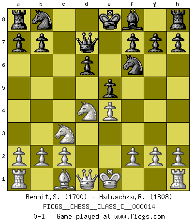 Last move : 0-1 2006 November 7 15:31:9 [Event "FICGS__CHESS__CLASS_C__000014"] [Site "FICGS"] [Date "2006.09.23"] [Round "1"] [White "Benoit,Sebastien"] [Black "Haluschka,Rainer"] [Result "0-1"] [WhiteElo "1700"] [BlackElo "1808"] 1.e4 c5 2.Nf3 d6 3.d4 cxd4 4.Nxd4 Nf6 5.Nc3 e5 6.Bb5+ Bd7 7.Bxd7+ Qxd7 0-1 This chess game has been lost on time (started : 2006.09.23 15:11:39) Sicilian : Venice attack Player Black won this chess game. Follow this game move after move (download)Dazzling combinations are for the many, shifting wood is for the few. (Georg Kieninger) Viele Opfer benötigen überhaupt keine konkrete Berechnung. Es genügt sich die entstehende Position kurz vorzustellen, um uns davon zu überzeugen, dass das Opfer korrekt ist. (Mikhail Nekhemyevich Tal) Las Aperturas te enseñan aperturas. ¡Los Finales te enseñan Ajedrez!. (Stephan Gerzadowicz) Le plus grand jeu de l'esprit jamais inventé, plus vous l'apprenez, plus vous y prenez du plaisir. (Garry Kasparov) Life is like internet, nothing interesting, but noone want to leave it. (Ilmars Cirulis)