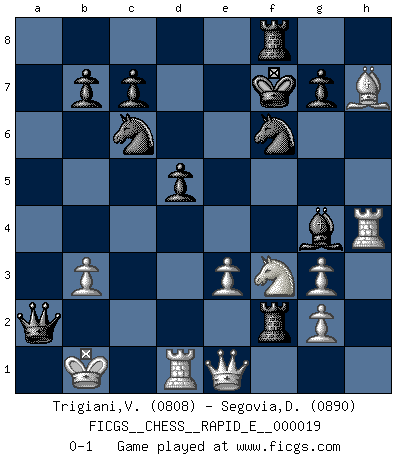 Last move : 0-1 2009 October 5 10:40:44 [Event "FICGS__CHESS__RAPID_E__000019"] [Site "FICGS"] [Date "2009.08.29"] [Round "1"] [White "Trigiani,Vincenzo"] [Black "Segovia,Didier"] [Result "0-1"] [WhiteElo "0808"] [BlackElo "0890"] 1.d4 d5 2.Bf4 Nc6 3.Nc3 f6 4.Nb5 e5 5.Bg3 a6 6.dxe5 axb5 7.exf6 Nxf6 8.Nf3 Bd6 9.e3 Bxg3 10.hxg3 b4 11.Bd3 Bg4 12.Qd2 O-O 13.O-O-O Rxa2 14.Kb1 Qa8 15.c3 bxc3 16.Qxc3 Qa4 17.b3 Qa7 18.Rh4 Rxf2 19.Bxh7+ Kf7 20.Qe1 Qa2+ 0-1 Queen's pawn, Mason variation Kingside Castling by player Black (move 12) Queenside Castling by player White (move 13) Player Black won this chess game. Follow this game move after move (download)I played Chess with him and would have beaten him sometimes only he always took back his last move, and ran the game out differently. (Mark Twain) Wenn sie aufgeben, dann danke ich Ihnen für das Spiel (Eventualzug beim Fernschach). (Anonymous) Debemos de asegurarnos de que el Ajedrez no se convierta en un lenguaje muerto, muy interesante, pero tan solo para un grupo muy pequeño. (Sytze Faber) La conception d'un plan est le processus par lequel un joueur exploite les avantages de sa position tout en s'efforçant d'en réduire au minimum les inconvénients. Afin de garantir le succès, un plan doit toujours se fonder sur un diagnostic objectif des particularités d'une position. La conception d'un plan est d'autant plus difficile que la position est équilibrée, et grandement facilitée lorsqu'il n'existe qu'un seul plan susceptible de répondre aux exigences de la position. (Harry Golombek) I don't diet. I just don't eat as much as I'd like to. (Linda Evangelista, supermodel)