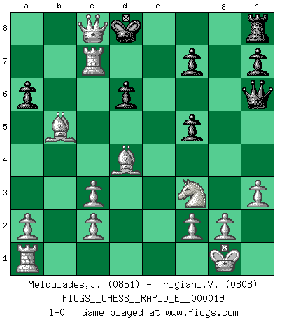 Last move : 1-0 2009 September 13 20:35:12 [Event "FICGS__CHESS__RAPID_E__000019"] [Site "FICGS"] [Date "2009.08.29"] [Round "1"] [White "Melquiades,Jay"] [Black "Trigiani,Vincenzo"] [Result "1-0"] [WhiteElo "0851"] [BlackElo "0808"] 1.e4 e5 2.Nf3 Bc5 3.Nc3 Nf6 4.d4 exd4 5.Bg5 dxc3 6.bxc3 Nc6 7.e5 d6 8.exf6 gxf6 9.Be3 Bg4 10.h3 Be6 11.Bb5 f5 12.O-O Bd5 13.Re1 Qf6 14.Bxc5 Kd8 15.Qxd5 Ne7 16.Qxb7 Rc8 17.Bd4 Qh6 18.Rxe7 a6 19.Rd7+ Ke8 20.Rxc7 Kd8 21.Qxc8+ 1-0 King's knight Opening Kingside Castling by player White (move 12) Player White won this chess game. Follow this game move after move (download)Later, I began to succeed in decisive games. Perhaps because I realized a very simple truth: not only was I worried, but also my opponent. (Mikhail Tal) Kasparov stellt für gewöhnlich die Regeln auf und bricht sie dann selbst wieder. (Alexej Shirov) Cuando tengo las piezas blancas, yo gano porque soy blanco; Cuando tengo las piezas negras, yo gano porque soy Bogolyubov. (Bogolyubov) Il vaut toujours mieux jouer un plan faux de façon logique que de n'avoir pas de plan du tout. (Victor Kortchnoï) When it is a question of money, everybody is of the same religion. (Voltaire)