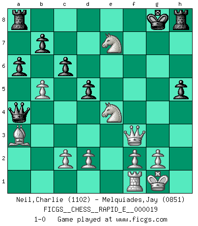 Last move : 1-0 2009 September 17 21:46:49 [Event "FICGS__CHESS__RAPID_E__000019"] [Site "FICGS"] [Date "2009.08.29"] [Round "1"] [White "Neil,Charlie"] [Black "Melquiades,Jay"] [Result "1-0"] [WhiteElo "1102"] [BlackElo "0851"] 1.e4 e5 2.Nf3 d6 3.Bc4 Nf6 4.Nc3 a6 5.a4 Be6 6.Bxe6 fxe6 7.b4 Nc6 8.O-O d5 9.b5 Nd4 10.Nxe5 Bd6 11.Nf3 c6 12.Nxd4 Bxh2+ 13.Kxh2 Qc7+ 14.Kg1 h5 15.Nxe6 Qe5 16.Nxg7+ Kf8 17.Nf5 Nxe4 18.Nxe4 Qxa1 19.Qf3 Qxa4 20.Ba3+ Kg8 21.Ne7+ 1-0 Philidor's defense Kingside Castling by player White (move 8) Player White won this chess game. Follow this game move after move (download)Some part of a mistake is always correct. (Savielly Tartakover) Schon mancher Spieler hat aufgegeben, um zu vermeiden, daß er eine Figur verliert. (Savielly Grigorievitsch Tartakower) Muchos se han convertido en Maestros de Ajedrez, nadie se ha convertido en el Maestro del Ajedrez. (Siegbert Tarrasch) Les échecs sont plus proches de l'art de l'assassinat que de l'art de la guerre. (Arturo Perez-Reverte) Whatever you do, don't be bored. This is absolutely the most exciting time we could have possibly hoped to be alive. And things are just starting. (From movie Waking life)