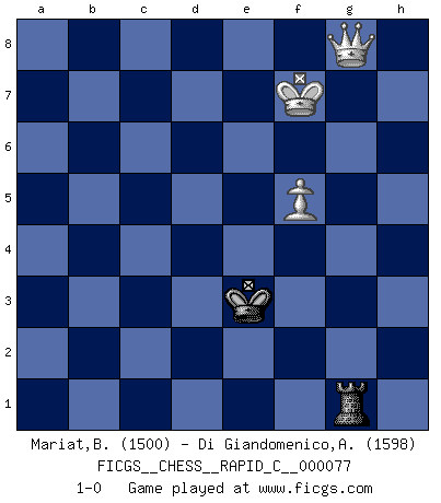 Last move : 1-0 2010 February 12 14:56:51 [Event "FICGS__CHESS__RAPID_C__000077"] [Site "FICGS"] [Date "2009.08.30"] [Round "1"] [White "Mariat,Benoit"] [Black "Di Giandomenico,Alfonso"] [Result "1-0"] [WhiteElo "1500"] [BlackElo "1598"] 1.c4 Nf6 2.g3 e5 3.Bg2 d6 4.Nc3 c6 5.e3 Be6 6.b3 Be7 7.Nge2 Nbd7 8.d4 d5 9.cxd5 Nxd5 10.Bb2 Nxc3 11.Bxc3 exd4 12.Nxd4 Bf6 13.Rc1 Bxd4 14.Qxd4 Nf6 15.O-O O-O 16.Rfd1 Qxd4 17.Bxd4 Nd5 18.a3 a5 19.b4 axb4 20.axb4 Nxb4 21.Rb1 Nc2 22.Rxb7 Nxd4 23.exd4 Bd5 24.Bxd5 cxd5 25.Rb5 Rfd8 26.Rc1 Rd7 27.R1c5 Rad8 28.Kg2 f5 29.Kf3 Kf7 30.Kf4 g6 31.f3 Ke6 32.Rb6+ Rd6 33.Rxd6+ Rxd6 34.Kg5 Ra6 35.Rc3 Kd6 36.Kh6 Ra2 37.Kxh7 Rxh2+ 38.Kxg6 Rg2 39.f4 Rd2 40.Kxf5 Rxd4 41.g4 Rc4 42.Rd3 Rc1 43.g5 Rg1 44.Kf6 Kc5 45.g6 Kc4 46.Rd2 d4 47.f5 Kc3 48.Rf2 d3 49.g7 d2 50.Rxd2 Kxd2 51.Kf7 Ke3 52.g8Q 1-0 English, 1...Nf6 (Anglo-Indian defense) Kingside Castling by player White (move 15) Kingside Castling by player Black (move 15) 10 pieces endgame at move 37 : White KRPPP , Black KRPPP WHITE : King + 1 Rook 3 Pawns BLACK : King + 1 Rook 3 Pawns 9 pieces endgame at move 38 : White KRPPP , Black KRPP WHITE : King + 1 Rook 3 Pawns BLACK : King + 1 Rook 2 Pawns 8 pieces endgame at move 40 : White KRPPP , Black KRP WHITE : King + 1 Rook 3 Pawns BLACK : King + 1 Rook 1 Pawn 7 pieces endgame at move 40 : White KRPP , Black KRP WHITE : King + 1 Rook 2 Pawns BLACK : King + 1 Rook 1 Pawn 6 pieces endgame at move 50 : White KRPP , Black KR WHITE : King + 1 Rook 2 Pawns BLACK : King + 1 Rook 5 pieces endgame at move 50 : White KPP , Black KR WHITE : King + 2 Pawns BLACK : King + 1 Rook Promotion Queen by player White (move 52) Player White won this chess game. Follow this game move after move (download)When the Chess game is over, the Pawn and the King go back to the same box. (Irish saying) Der Schachmeister von Heute braucht Courage, einen Killerinstinkt, Ausdauer und Arroganz. (Larry Evans) Ciertamente, de todas la drogas del mundo, el Ajedrez debe ser el mas placentero permamentemente. (Assiac) Je ne suis pas le dernier à jouer lâchement des coups douteux pendant le zeïtnot de l'adversaire pour l'achever: en effet les coups qui font le plus peur sont ceux que l'on ne comprend pas. Je me fais souvent peur quand je joue. (Un professeur anonyme) I couldn't make any sense out of what this particular thread is about. It sounds like R2 D2 computer speaking. A space fight ?!? Some 'command' problems in Moscow ? Some killers & narcotic addicts attacking some game & a god wannabe ?? (Dinesh De Silva, lost in a russian conflict in FICGS forum)